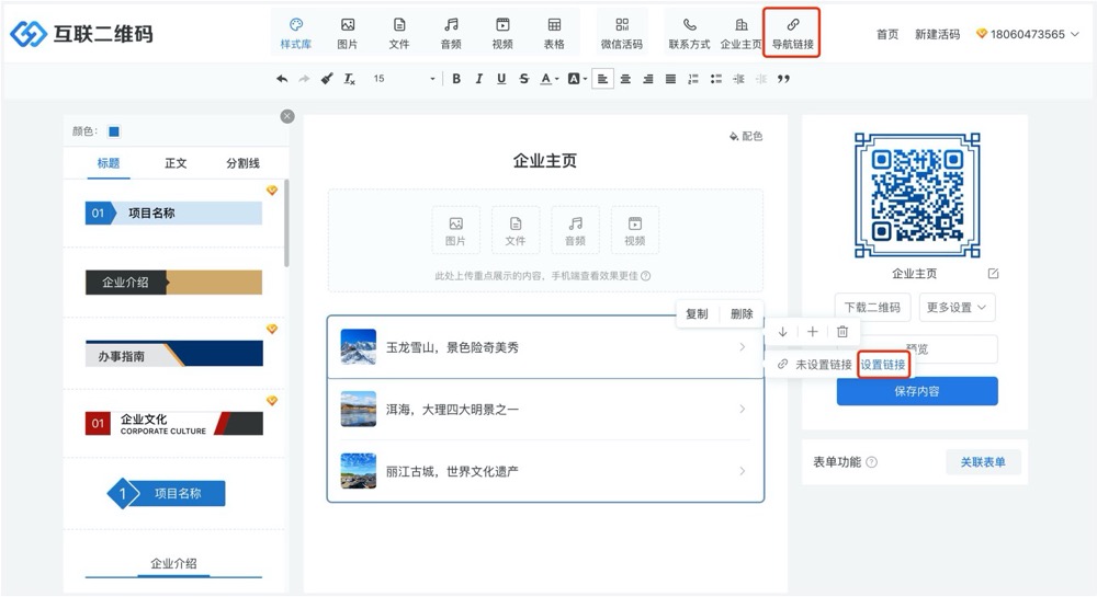 2. 对主页进行编辑或修改,推荐使用导航链接功能设置不同内容的入口,同时还可以通过添加视频、图片等模块来丰富主页内容。