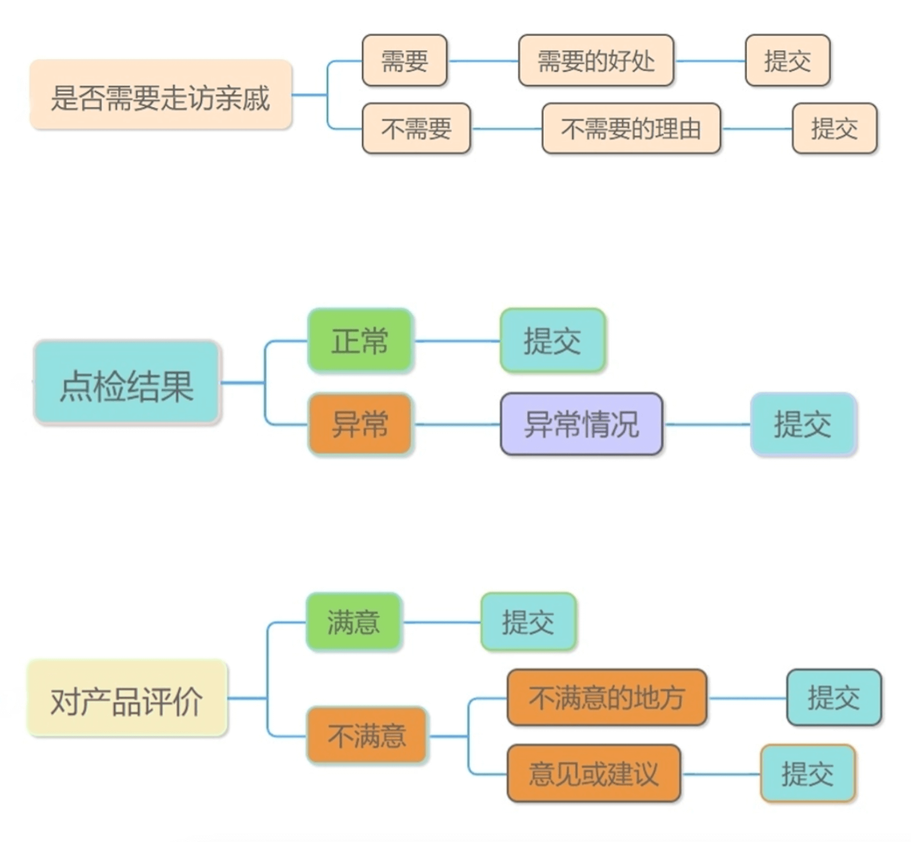 我们以问卷、点检、评价为例,思维导图如下: