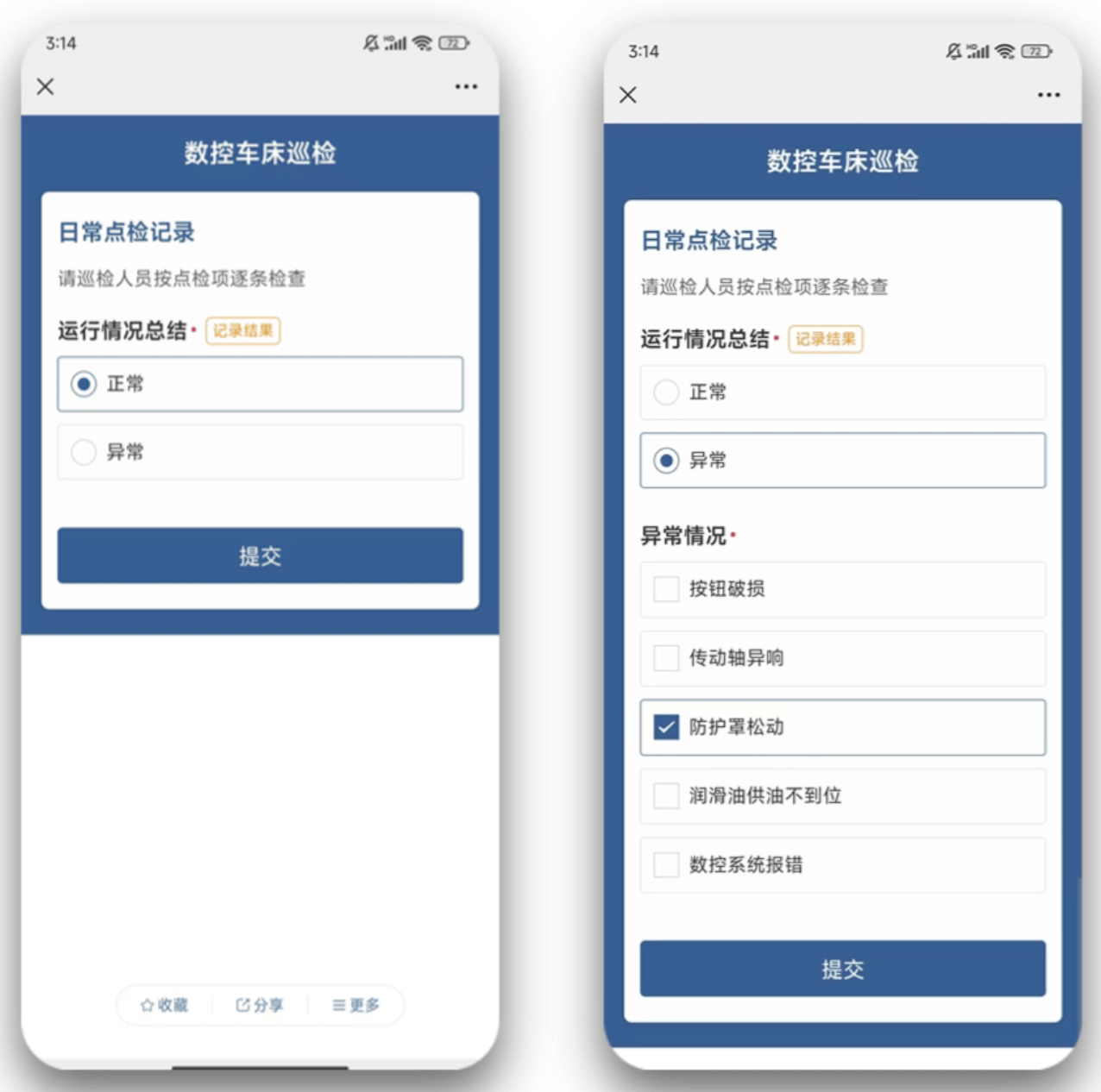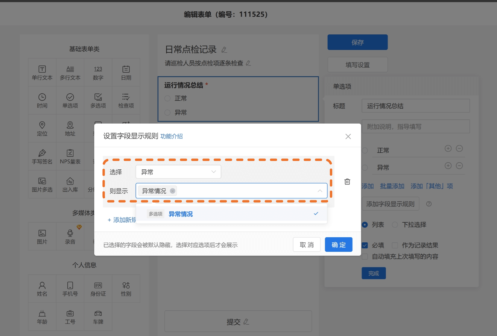 若选择“正常”这个选项,则“异常情况”这个问题被隐藏,不会被巡检人员看到。