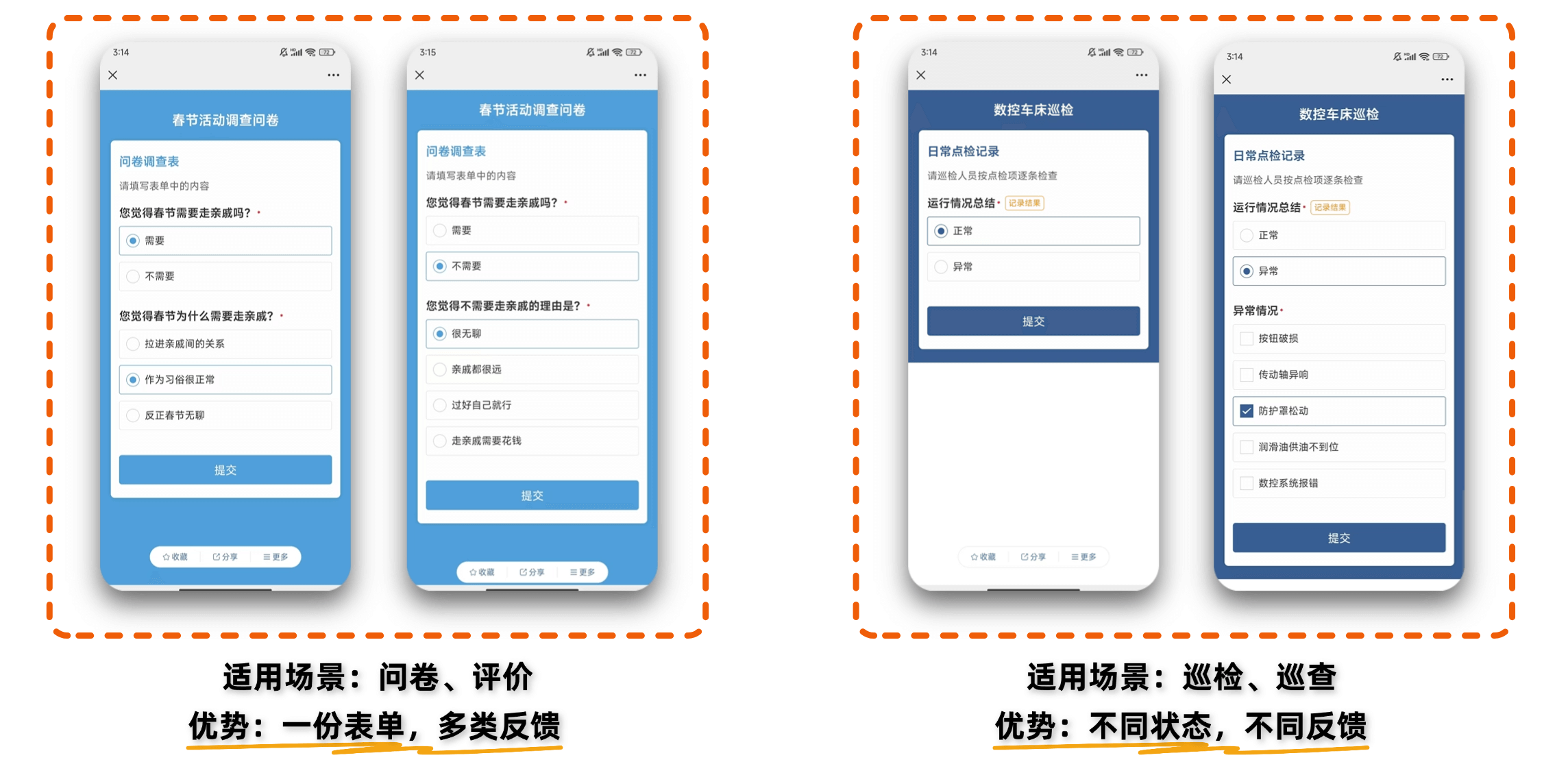 通过互联二维码的表单功能,设置显隐功能,实现选择不同选项后出现不同的内容。此功能适用于问卷调查、满意度评价、点检巡检等场景中。显隐功能的应用,能让用户实现仅需通过一份表单,就能得到两份甚至多份的反馈效果,提高效率。