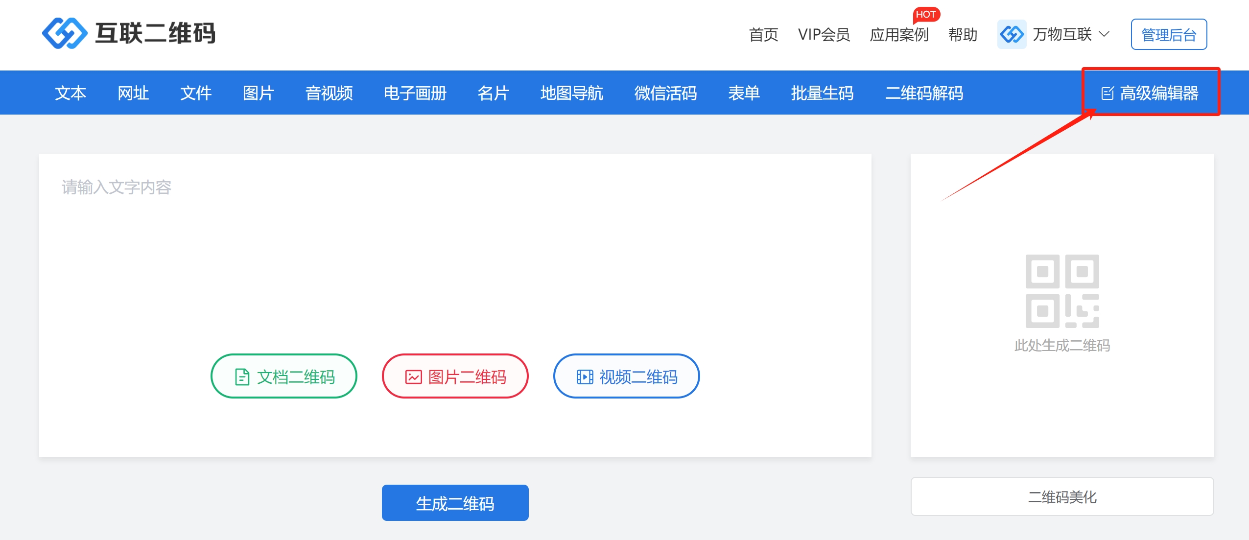 在互联二维码生成器官网首页导航栏点击【高级编辑器】选项进入。