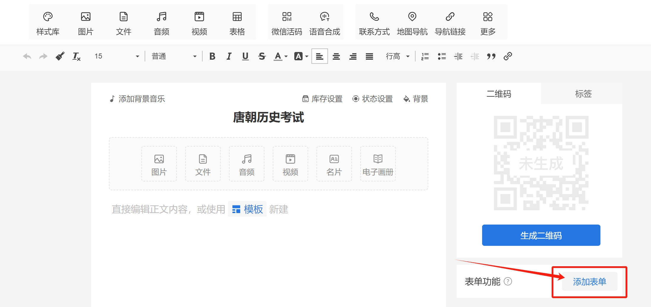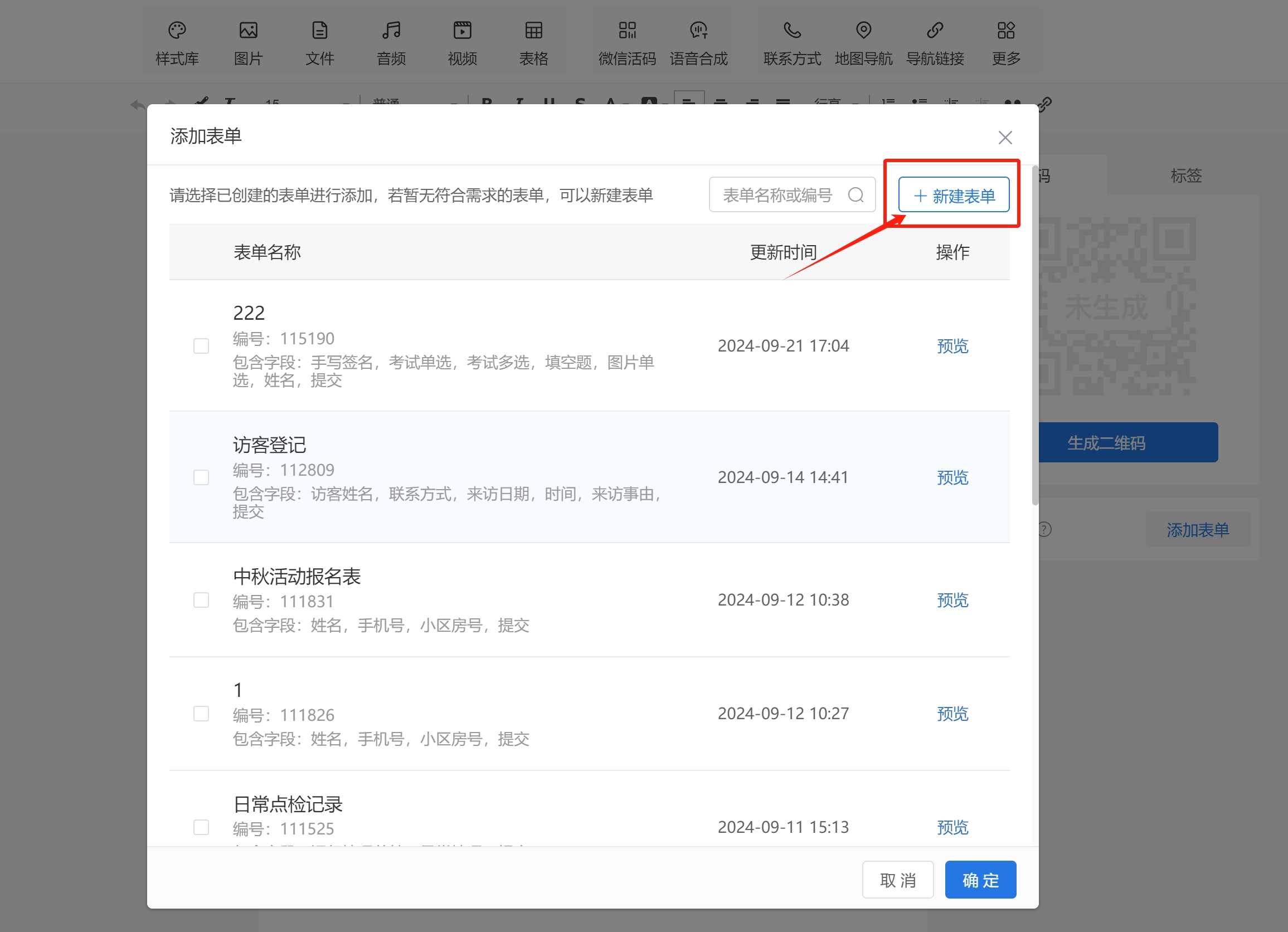 在高级编辑器右侧点击“添加表单”,进入表单选择页面。