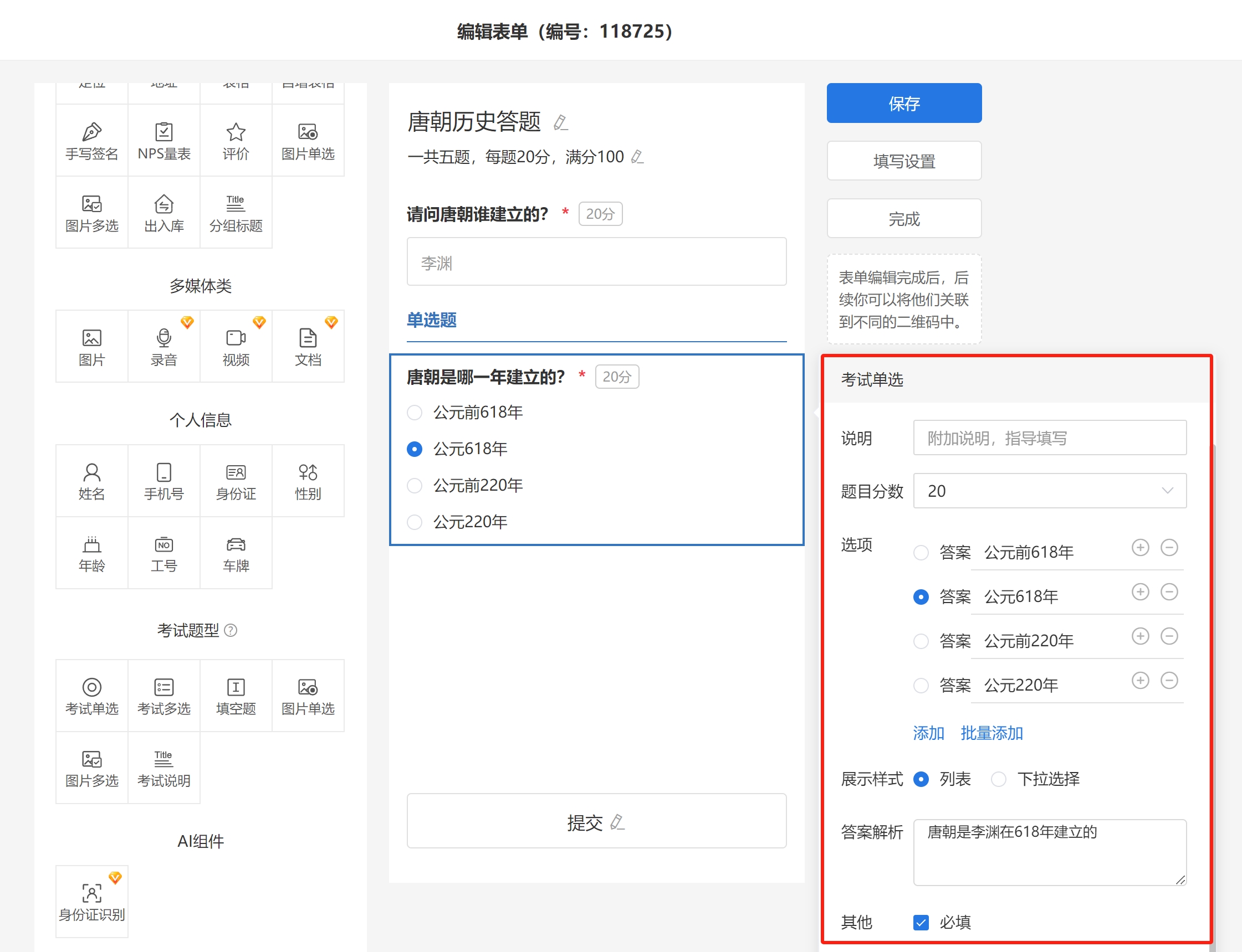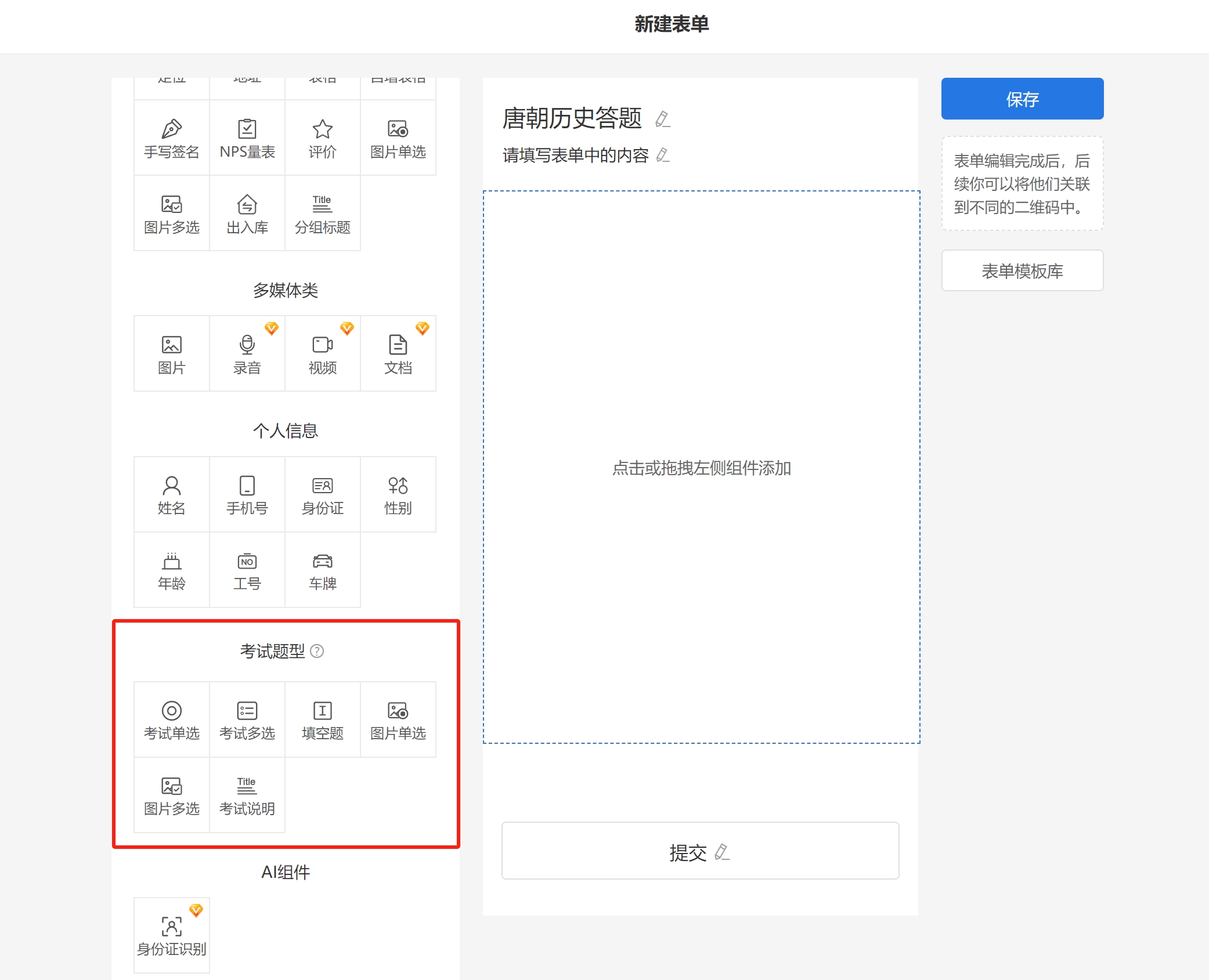 要制作考试型表单,必须使用“考试题型”组件,组件选择完成后单击组件,可以对组件内容进行设置。
