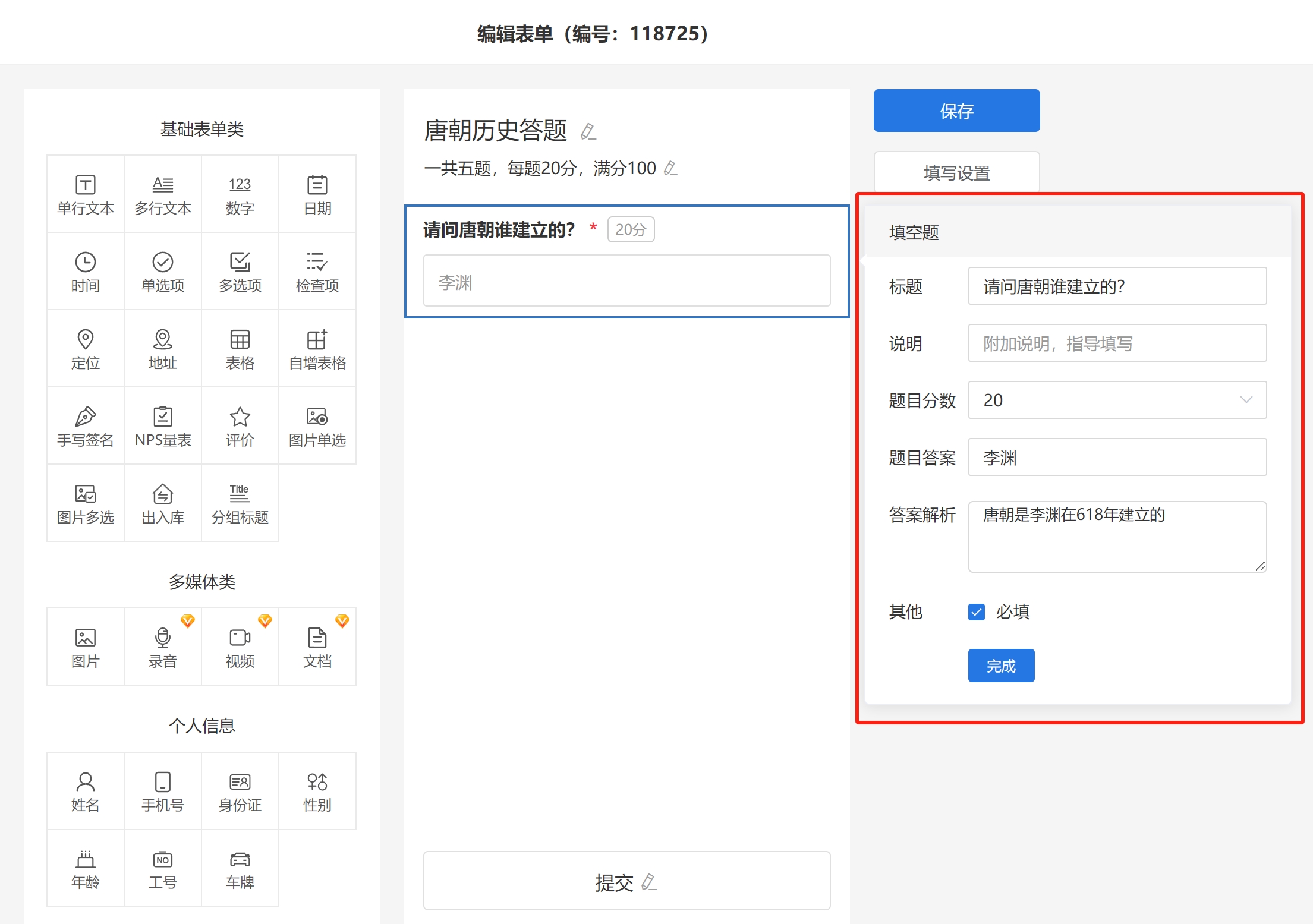 填空题:设置填空题,编辑答案内容,题目答案不能为空。