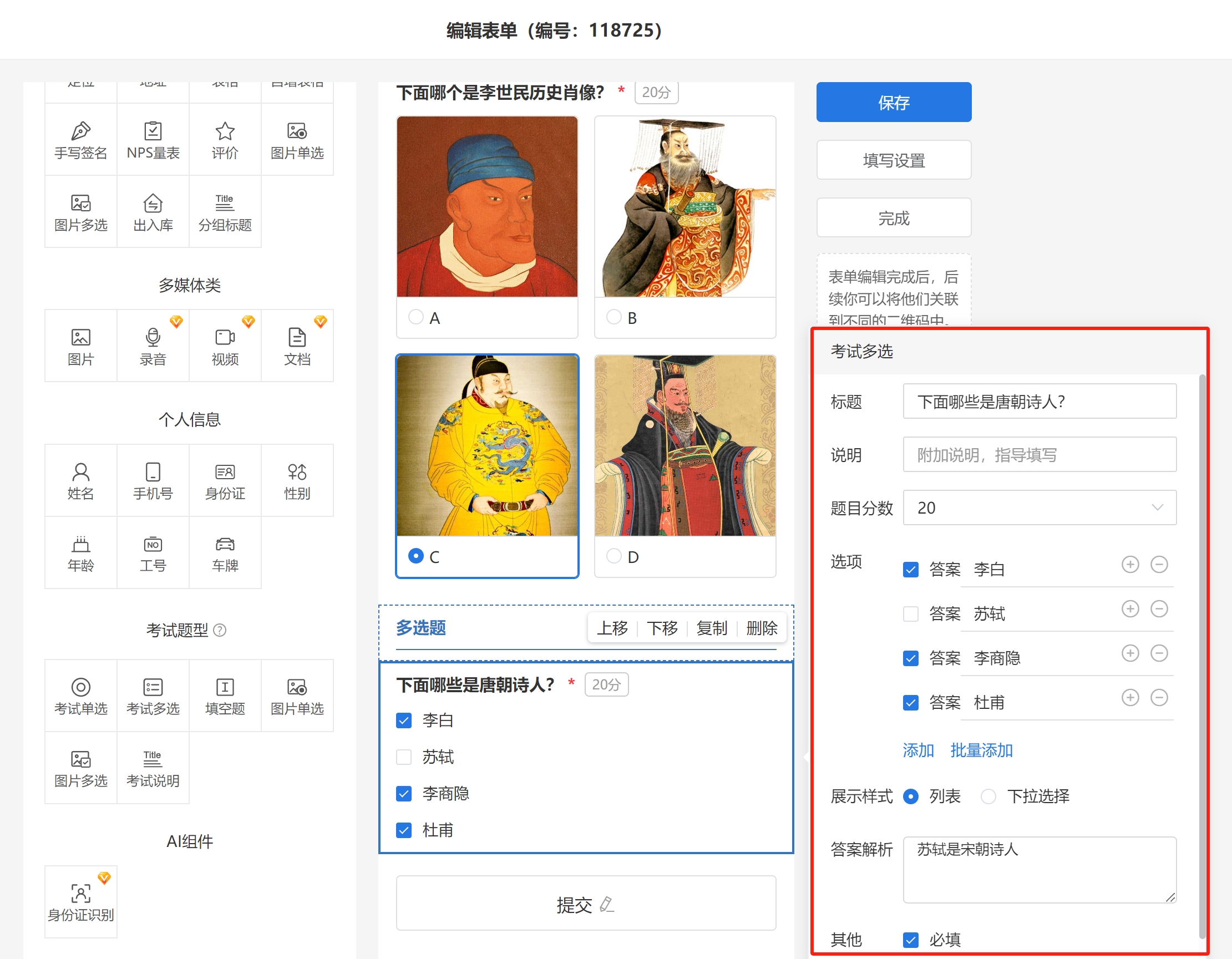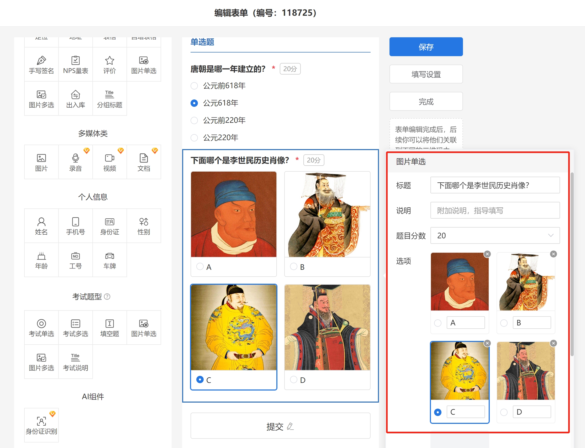图片单选:设置选项为图片的单选题,选中的选项为答案,答案不能为空。