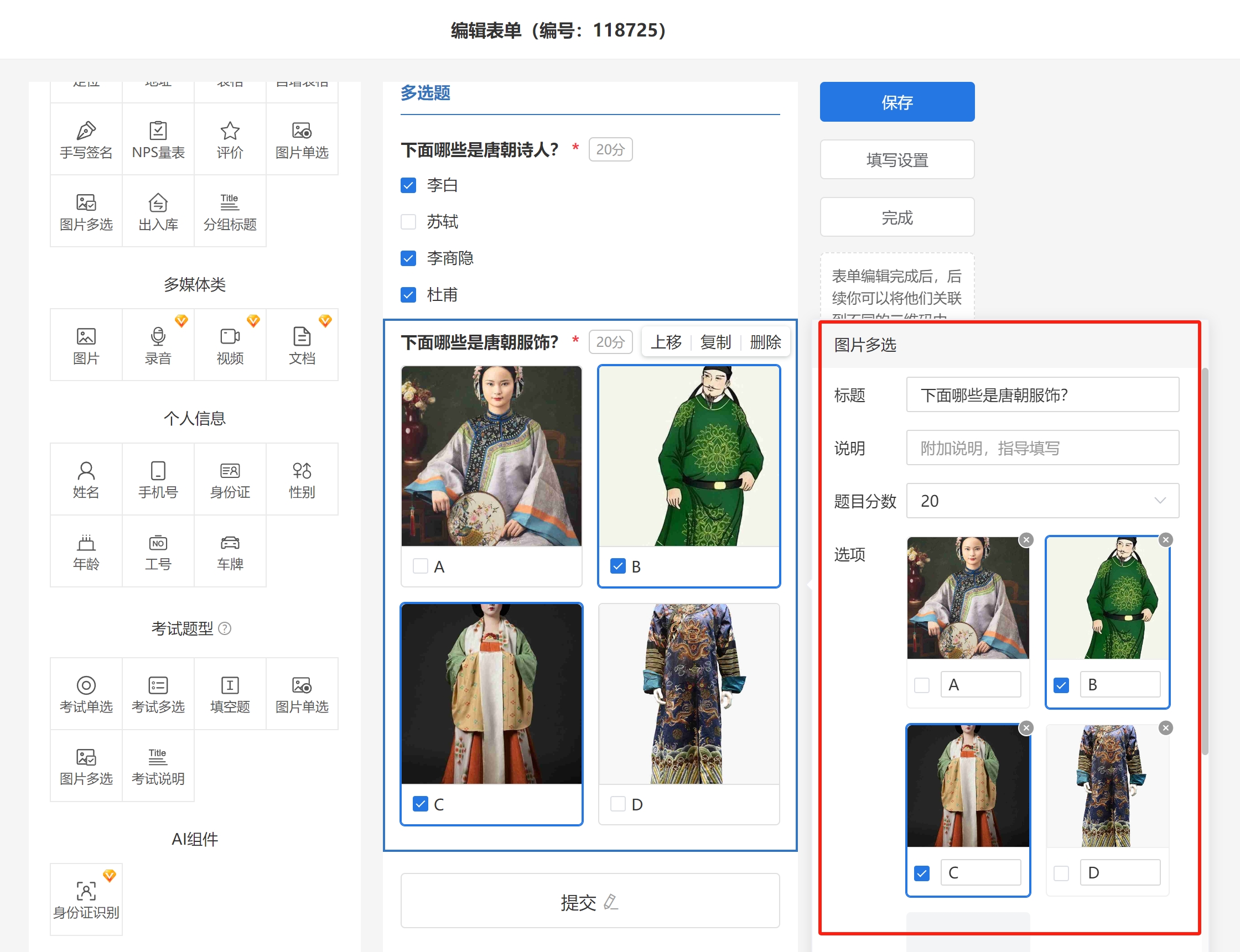 图片多选:设置选项为图片的多选题,选中的选项为答案,答案不能为空,答题时必须全部选对才能得分否则该题得分为0分。