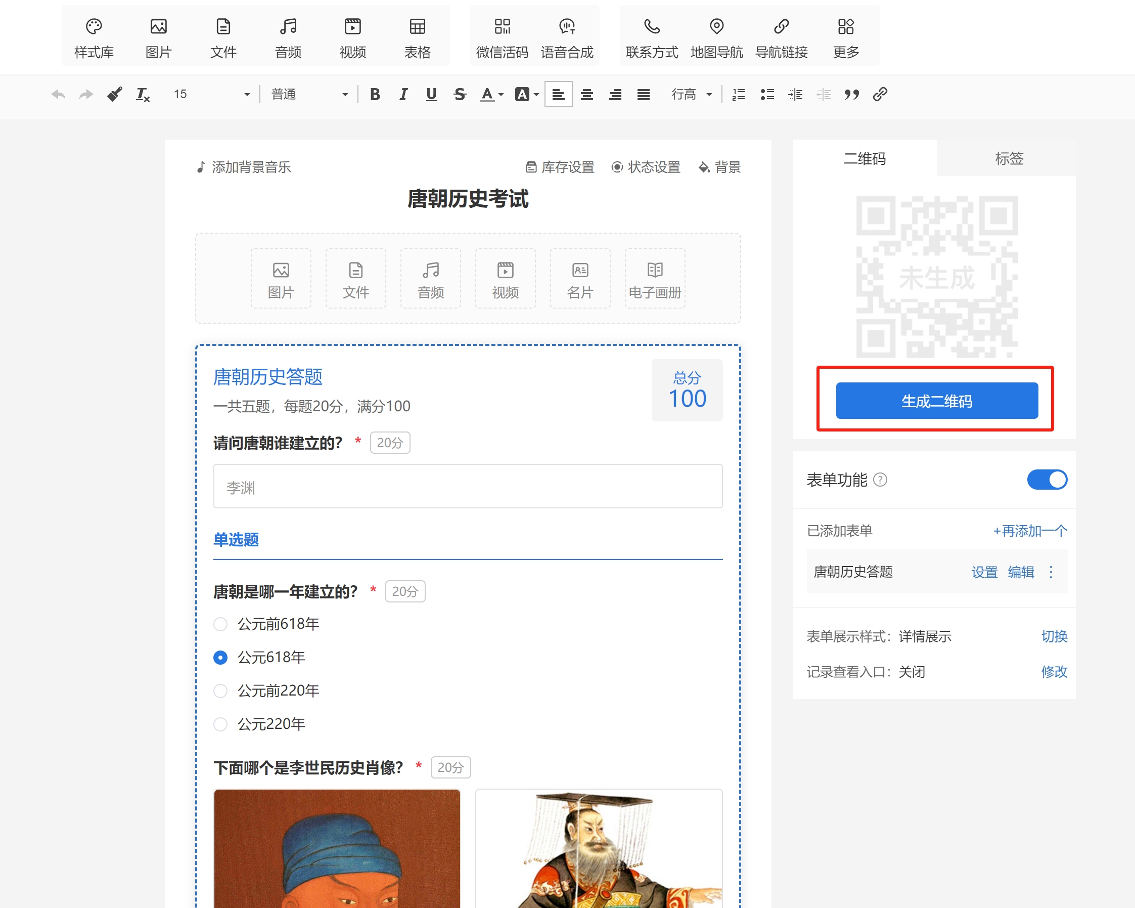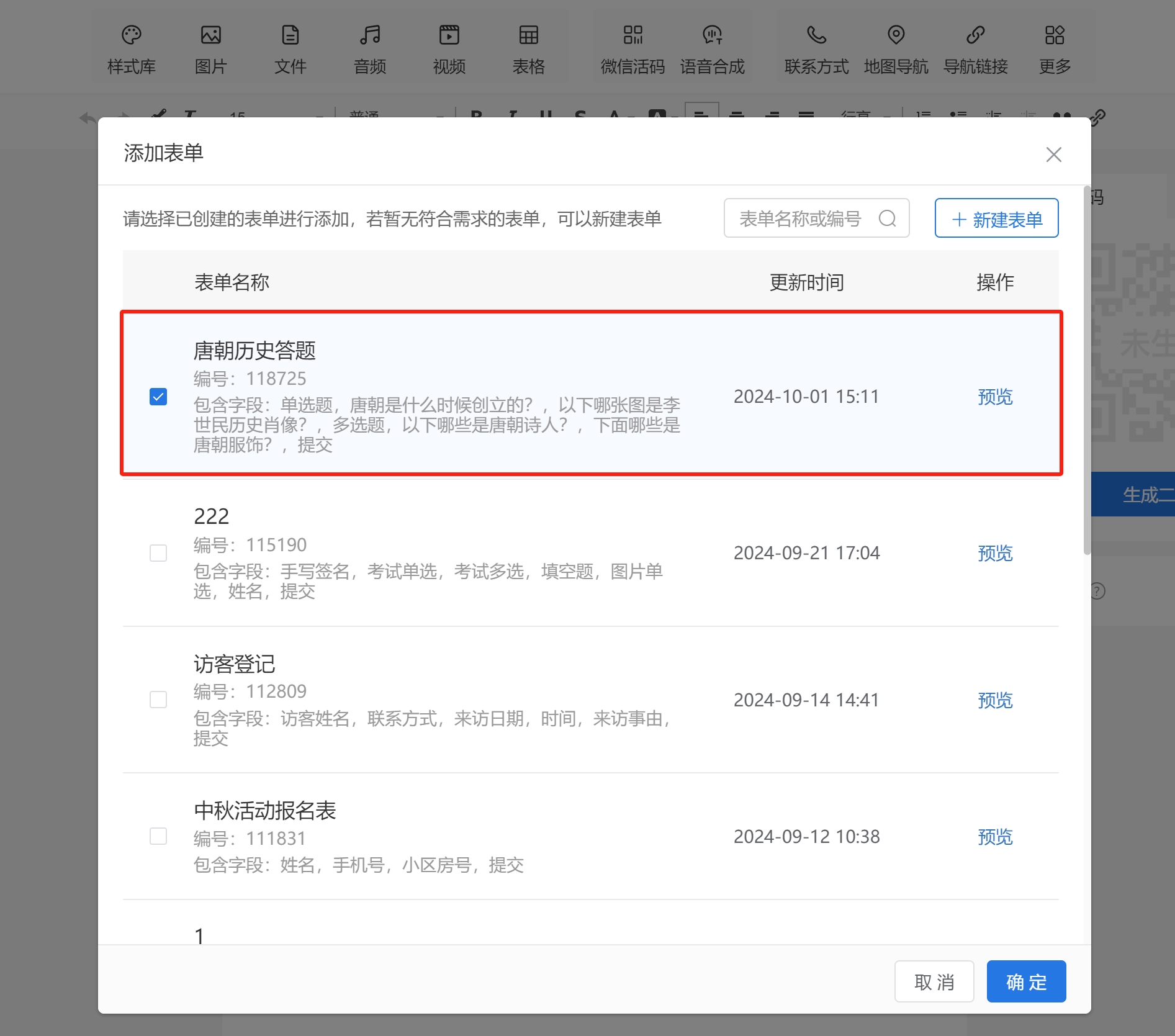 表单内容编辑完成后点击“保存”,回到表单选择页,勾选刚制作的考试表单插入到二维码内容中。