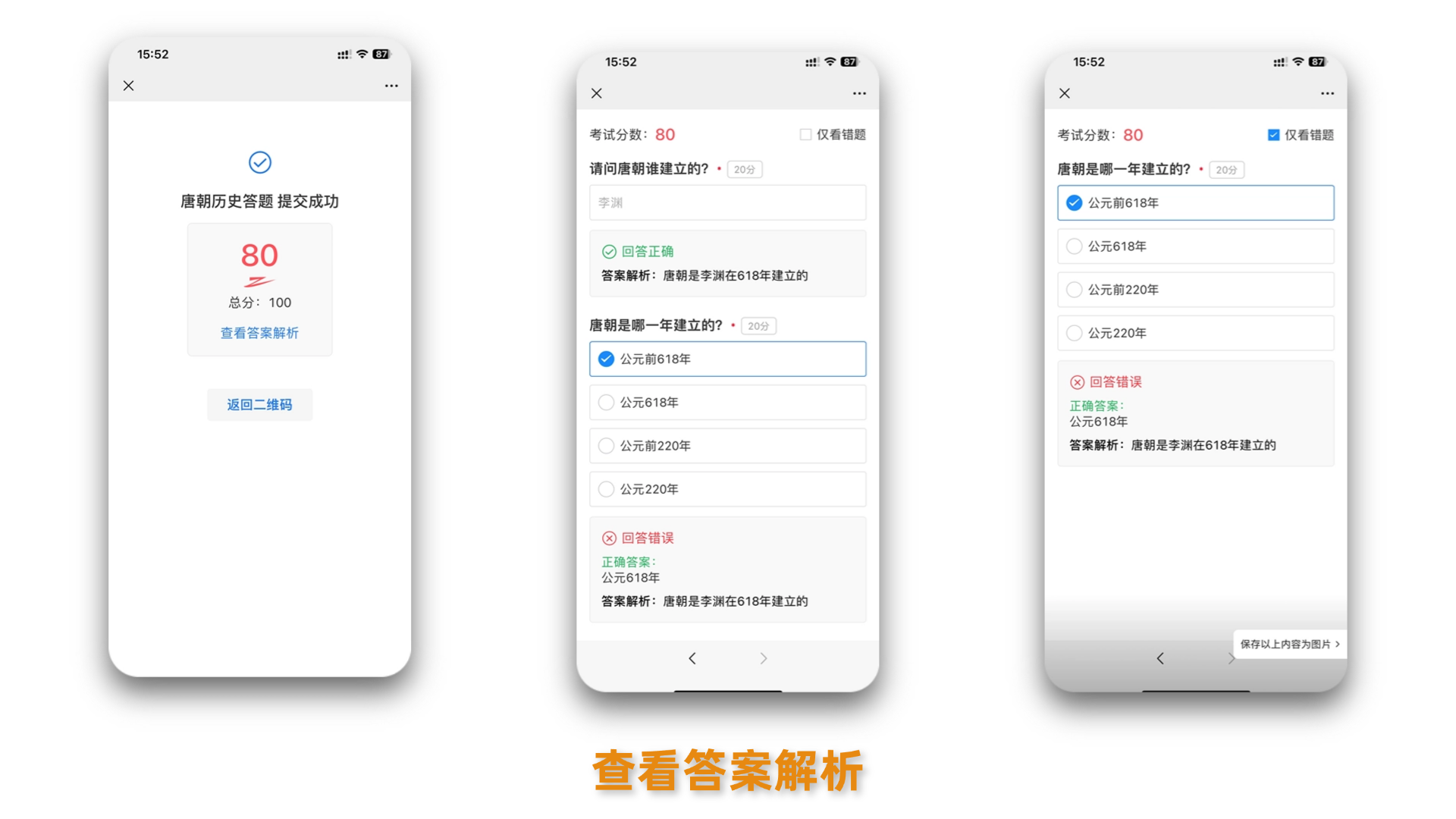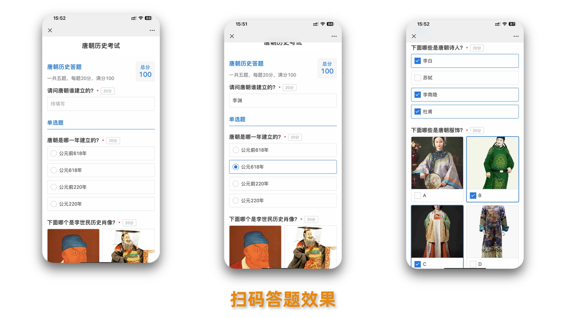 使用互联二维码生成器的表单功能,通过考试题型组件生成考卷,用户填写后自动计算分数。并且还可以生成答案解析,帮助答题者更好的学习。