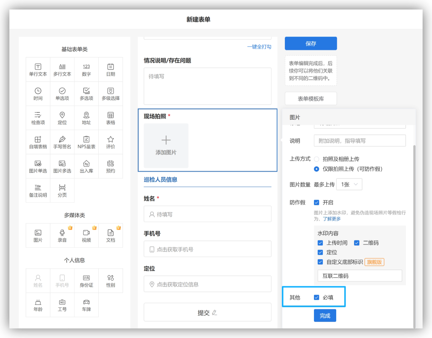 最后根据实际使用需求,选择是否将拍照上传操作设为必要操作。如是员工必要操作,勾选“必填”项,强制员工在巡检或点检时拍照上传,否则将无法提交表单。