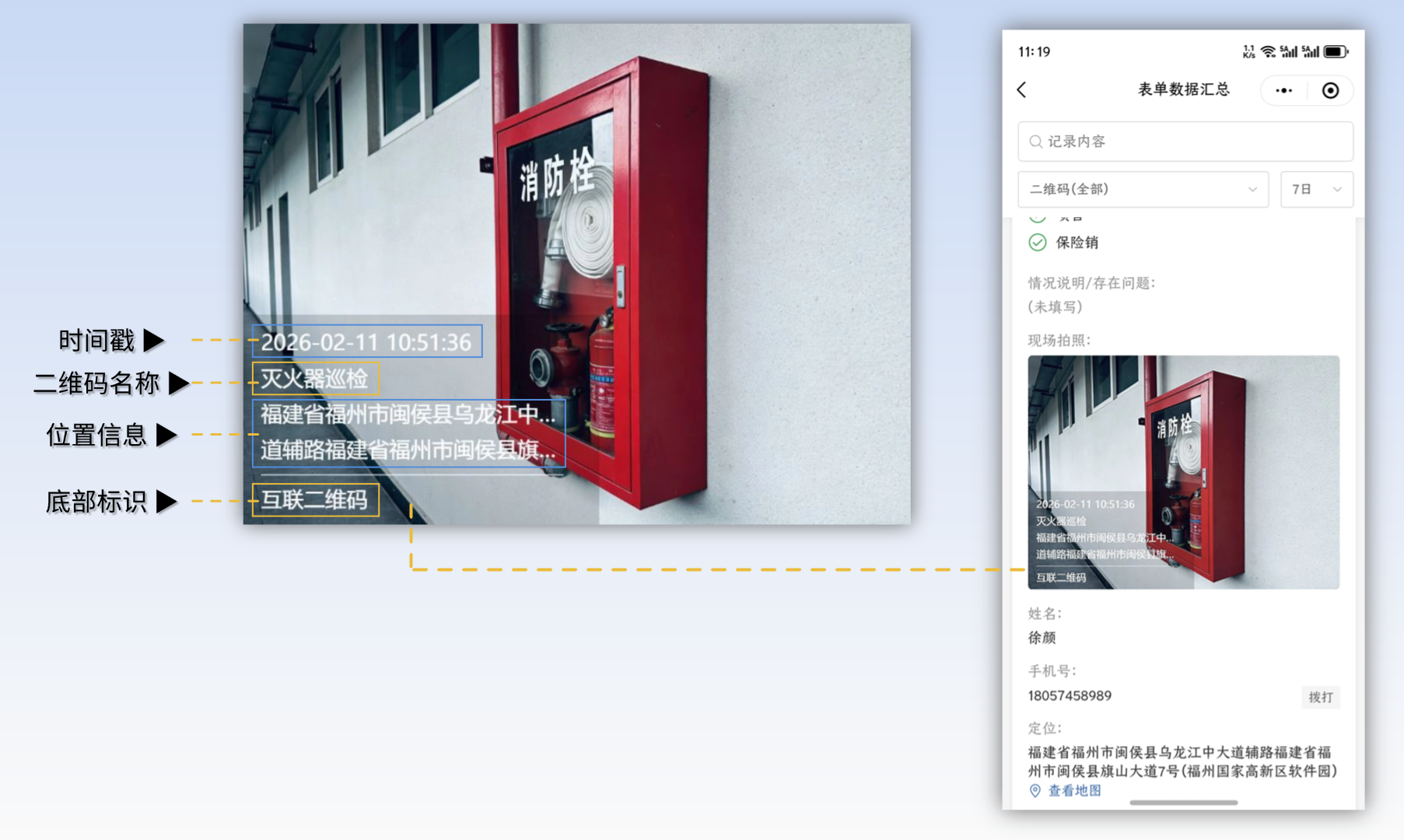 巡检人员拍摄设备状态时,水印自动附加二维码名称、时间与精确位置,确保每张照片皆对应具体的时间点与设备点位,有效杜绝事后补拍或虚假填报,为设备保养与故障追溯提供真实依据。
