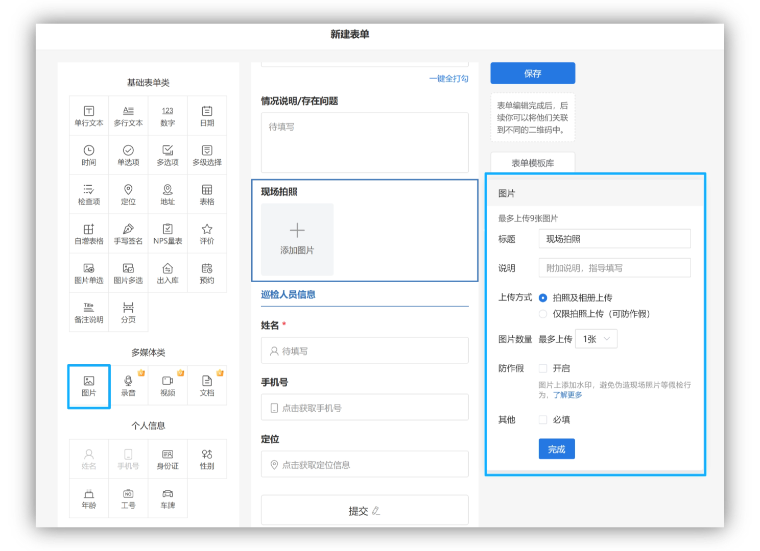 同时设置图片的上传方式为“仅限拍照上传”,可确保照片是在现场拍摄的。