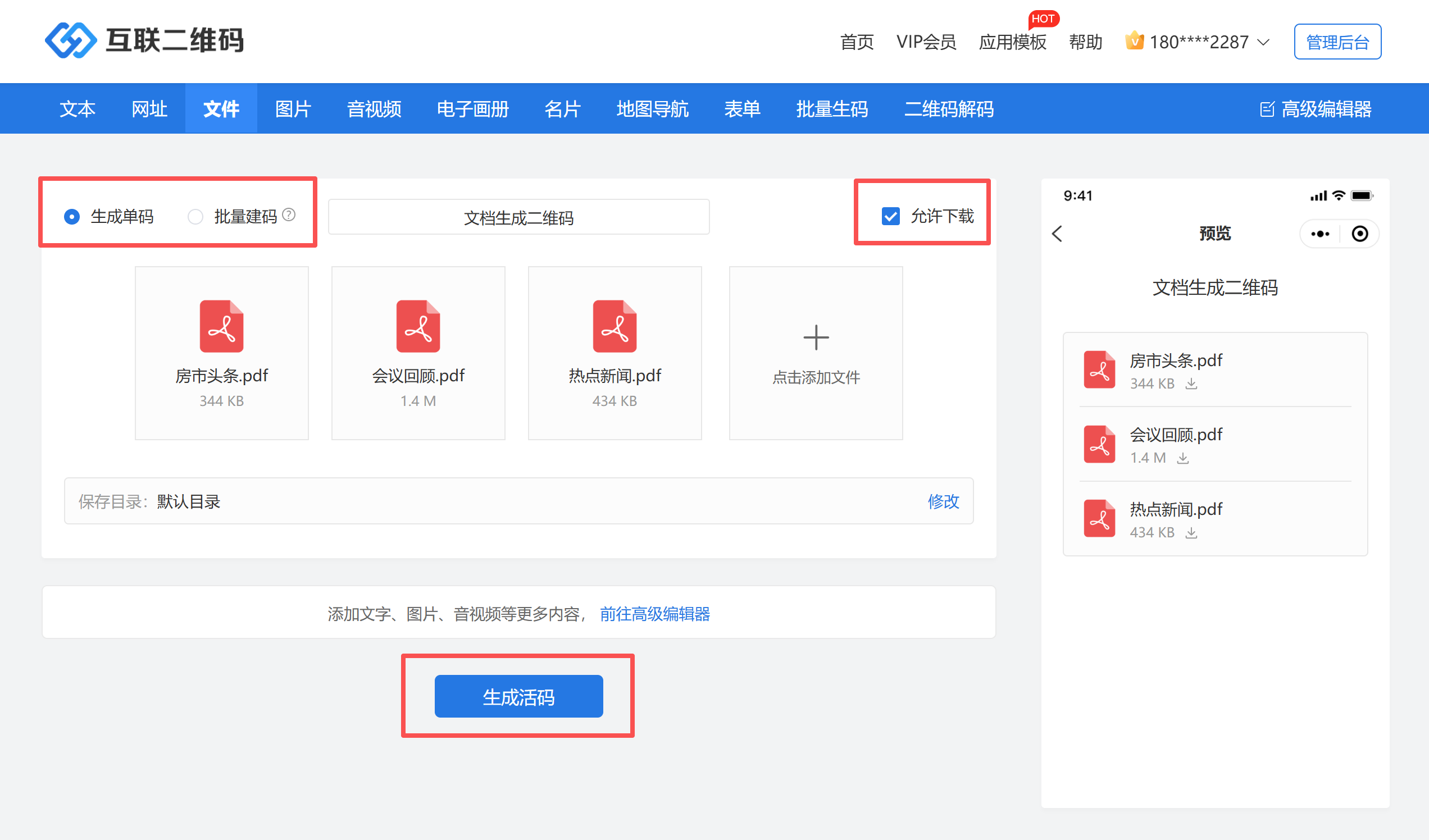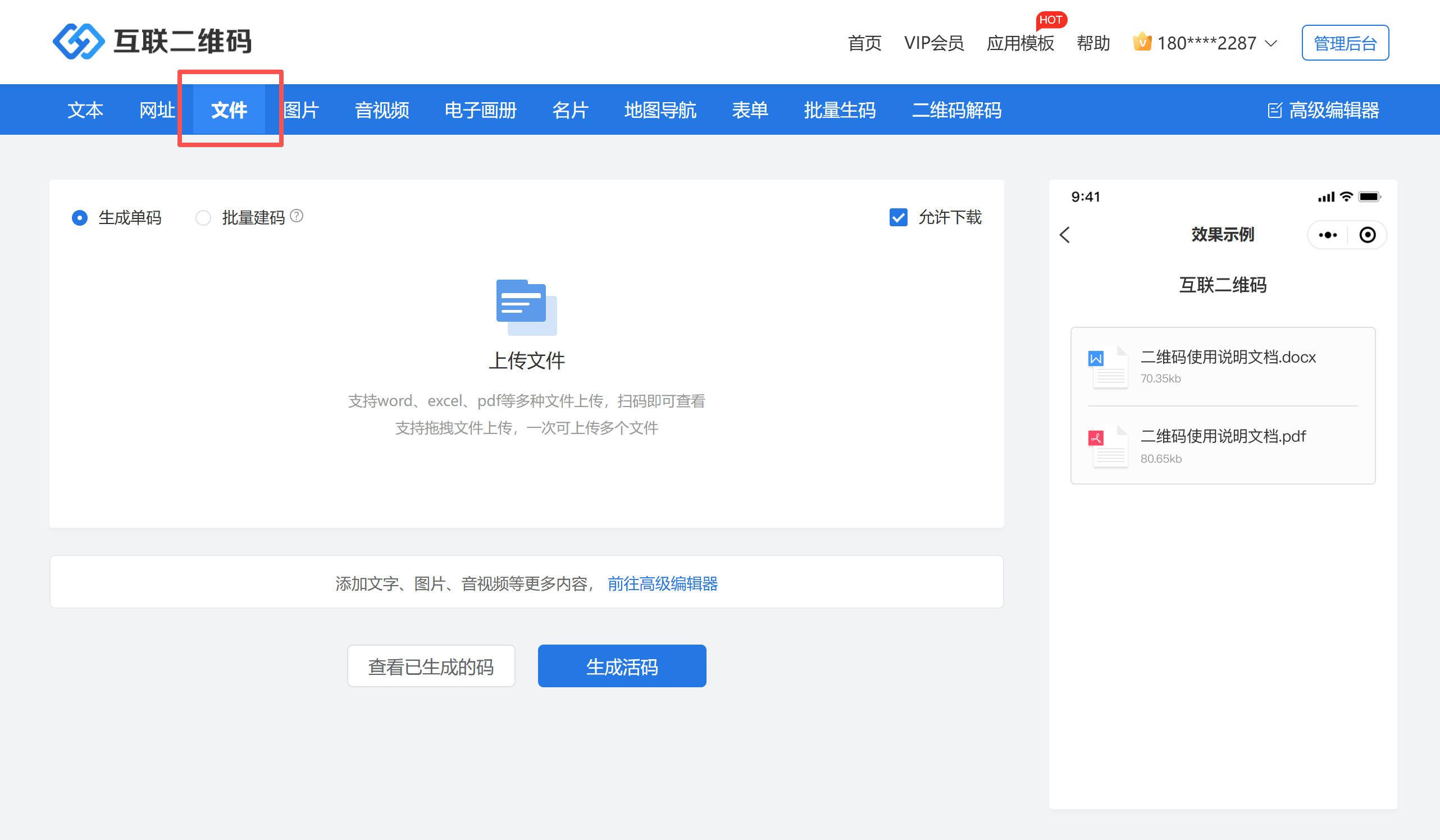 文件全部上传完成后点击下方的【生成活码】,再将生成的二维码下载保存,一个文件二维码就做好了。