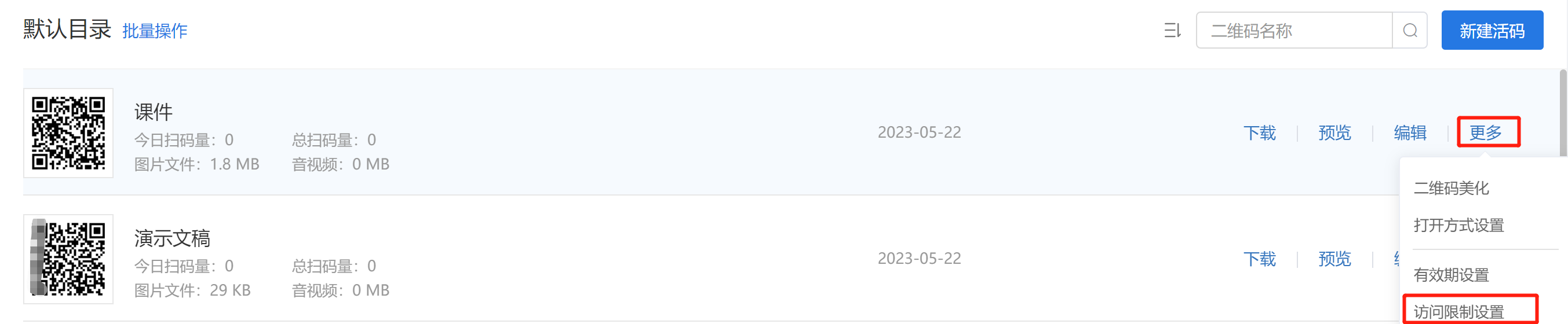 在生成二维码后,我们可以进入【管理后台】-【二维码活码】中对特殊课件设置访问权限,比如说是否需要输入密码才能访问,访问时间限制等等。通常情况下,我们默认不需要输入密码就可以访问。