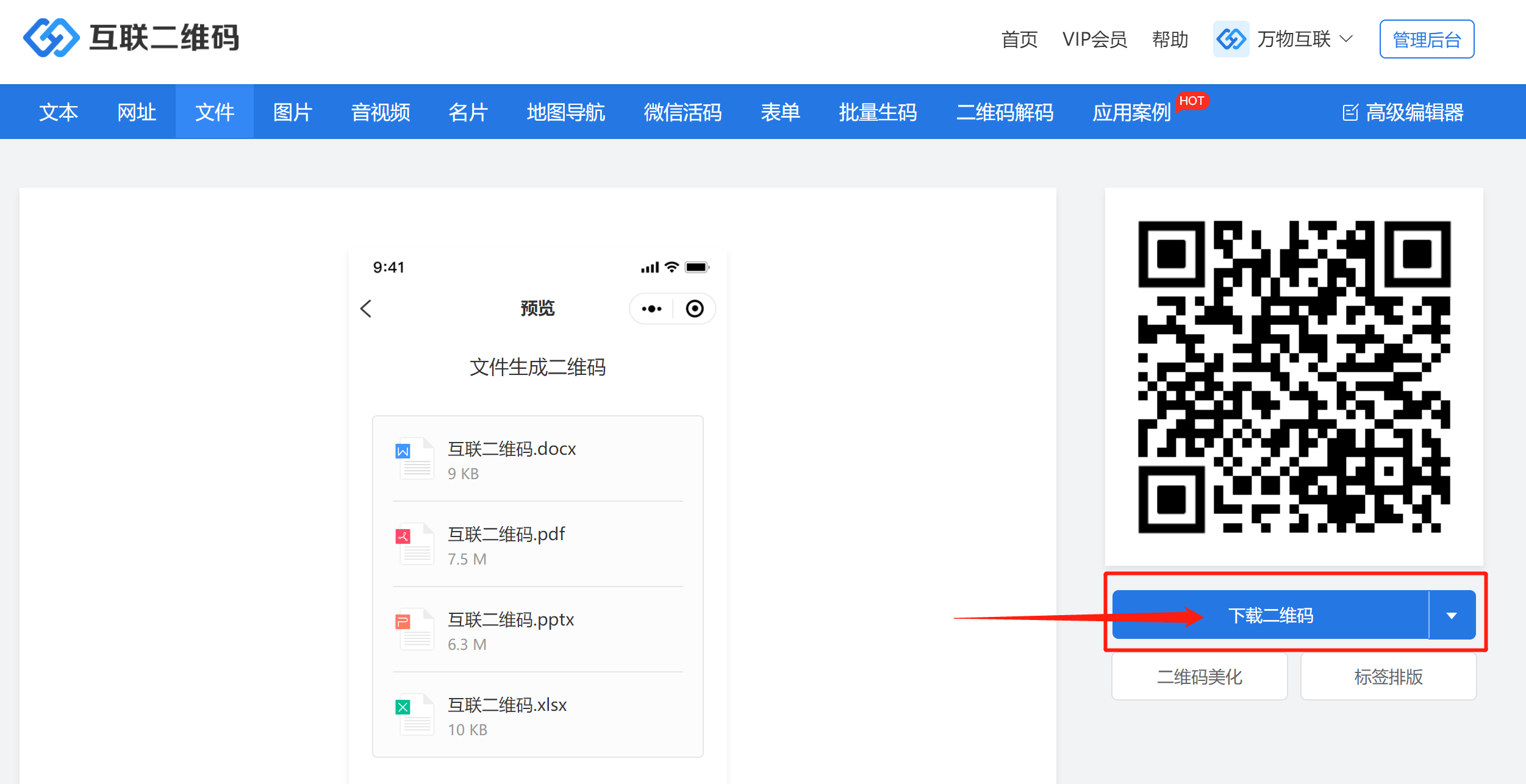 互联二维码生成器支持将Excel、Word、PDF、PPT等格式文件生成二维码活码,可以在一个二维码里放进多个不同格式的文件,扫码点击文件即可查看。
