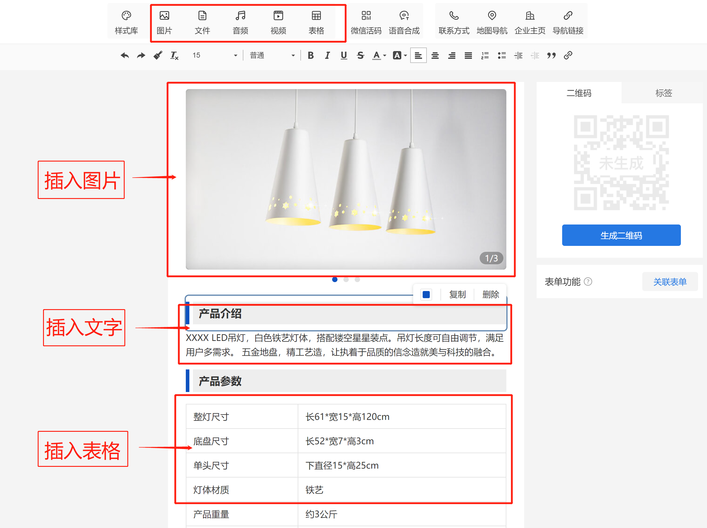 点击工具栏工具选项,可以在二维码内容里插入文字、图片、音频、视频、表格等内容,简单排版,即可制作出精美内容。