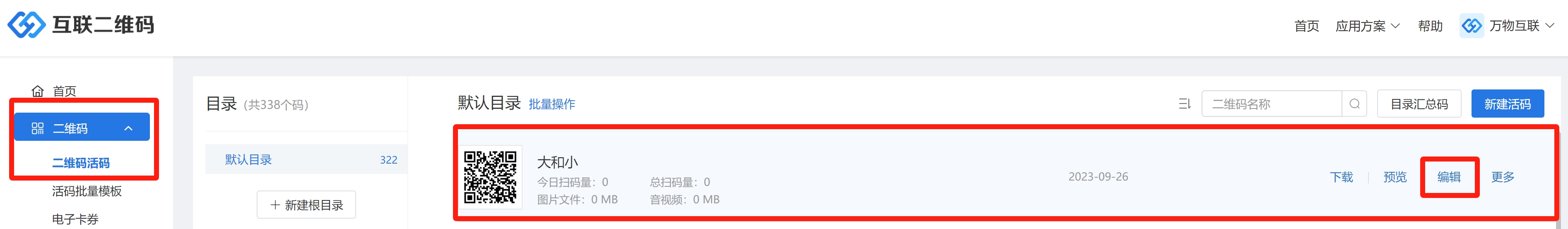 进入管理后台后再左侧导航栏选择【二维码】【二维码活码】,接着找到需要修改内容文章二维码,点击【编辑】即可进入二维码内容编辑页面。