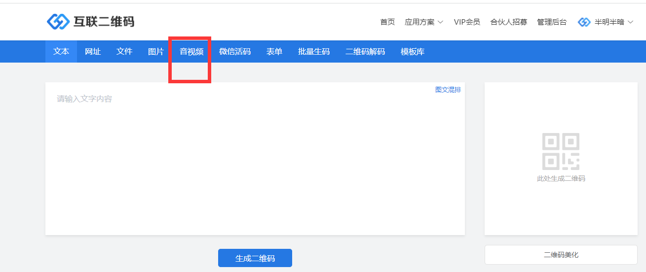首先,搜索互联二维码,点击官网进去可以看到一个音视频的导航,点击。