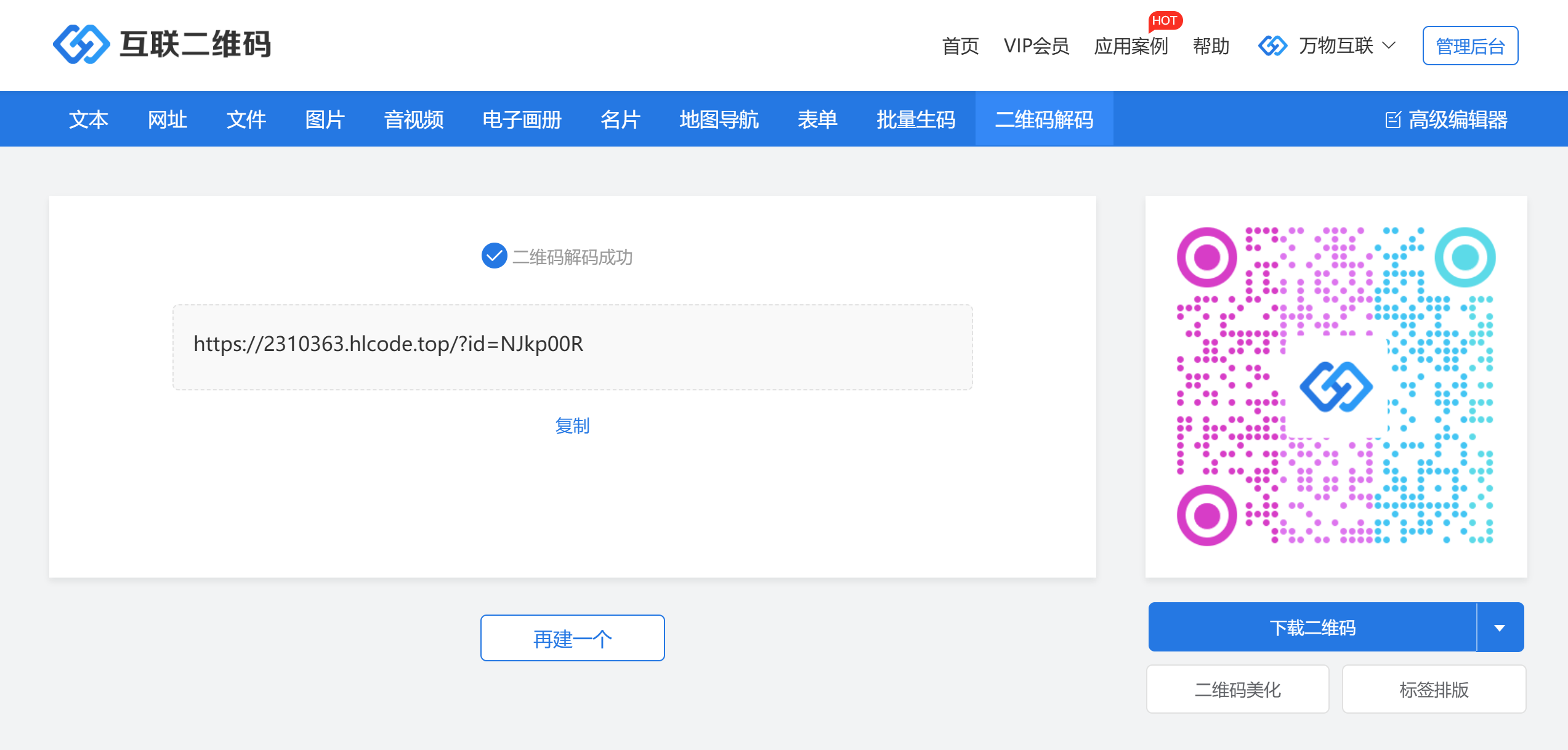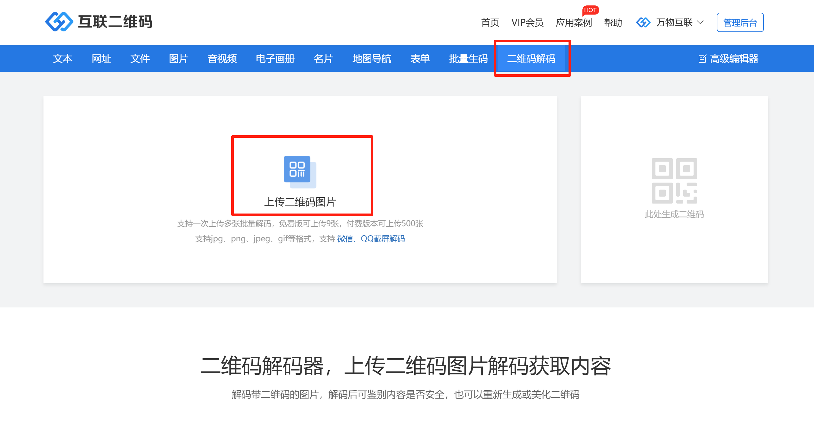 进入解码器:在互联二维码平台首页点击【二维码解码】;