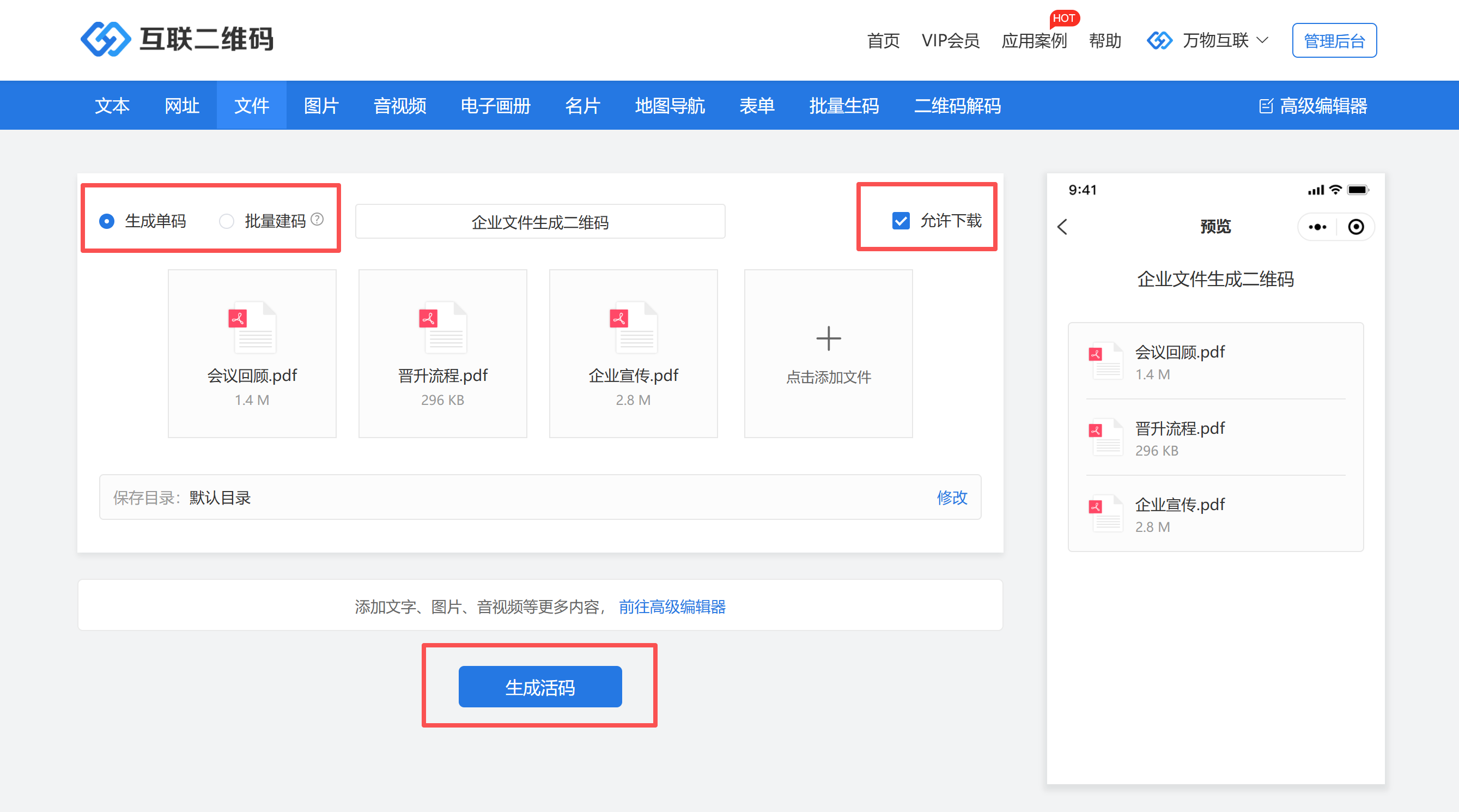一次通知常常包含多个附件:一份Word通知、一个Excel统计表、一份PDF附件。传统方式需要发送多个文件。通过互联二维码的文件二维码生成器的「生成单码」功能,可将所有文件汇总到一个二维码中。员工扫码,所有文件一目了然,再也不会遗漏。