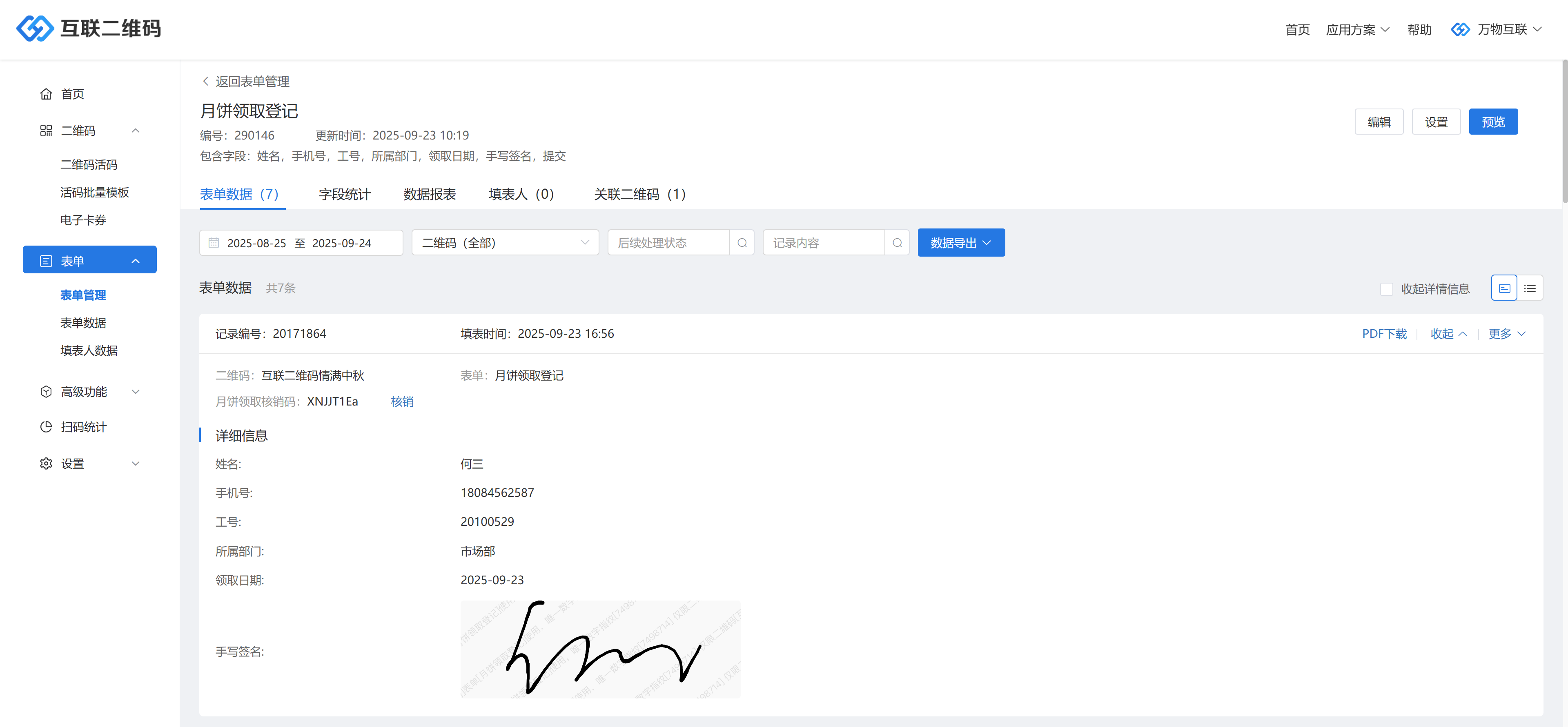 使用互联二维码的表单与核销码功能,企业可实现中秋福利的在线登记和精准发放。员工扫码填写礼品领取表单,系统自动生成唯一核销码,凭码领取月饼或礼品,避免错发漏发,后台还可实时查看领取情况。