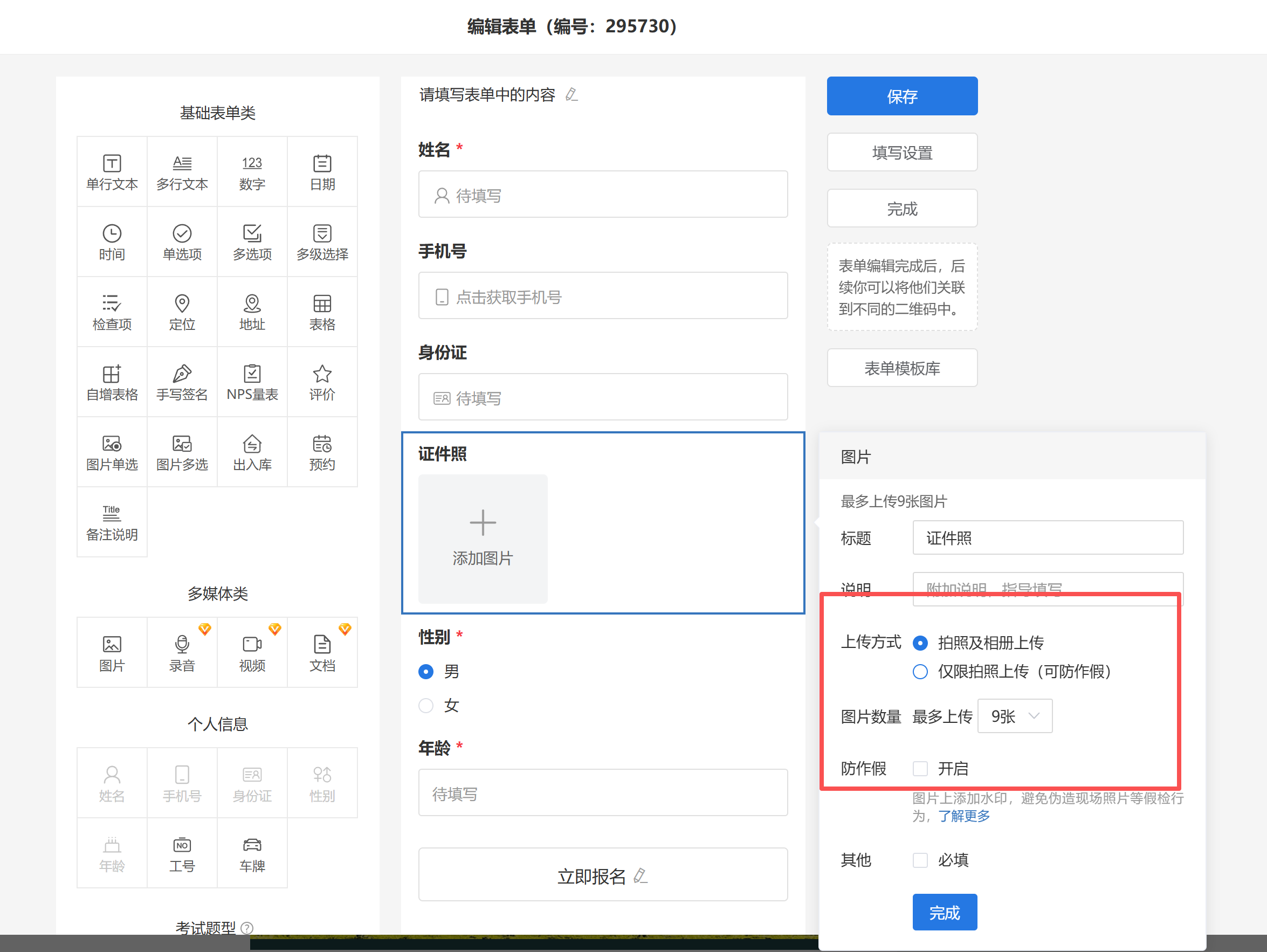 通过预设字段类型、格式要求和必填设置,从源头上保证了信息的完整性与规范性。身份证自动识别、选项式填写、图片上传引导等功能,显著降低了客户的操作门槛。
