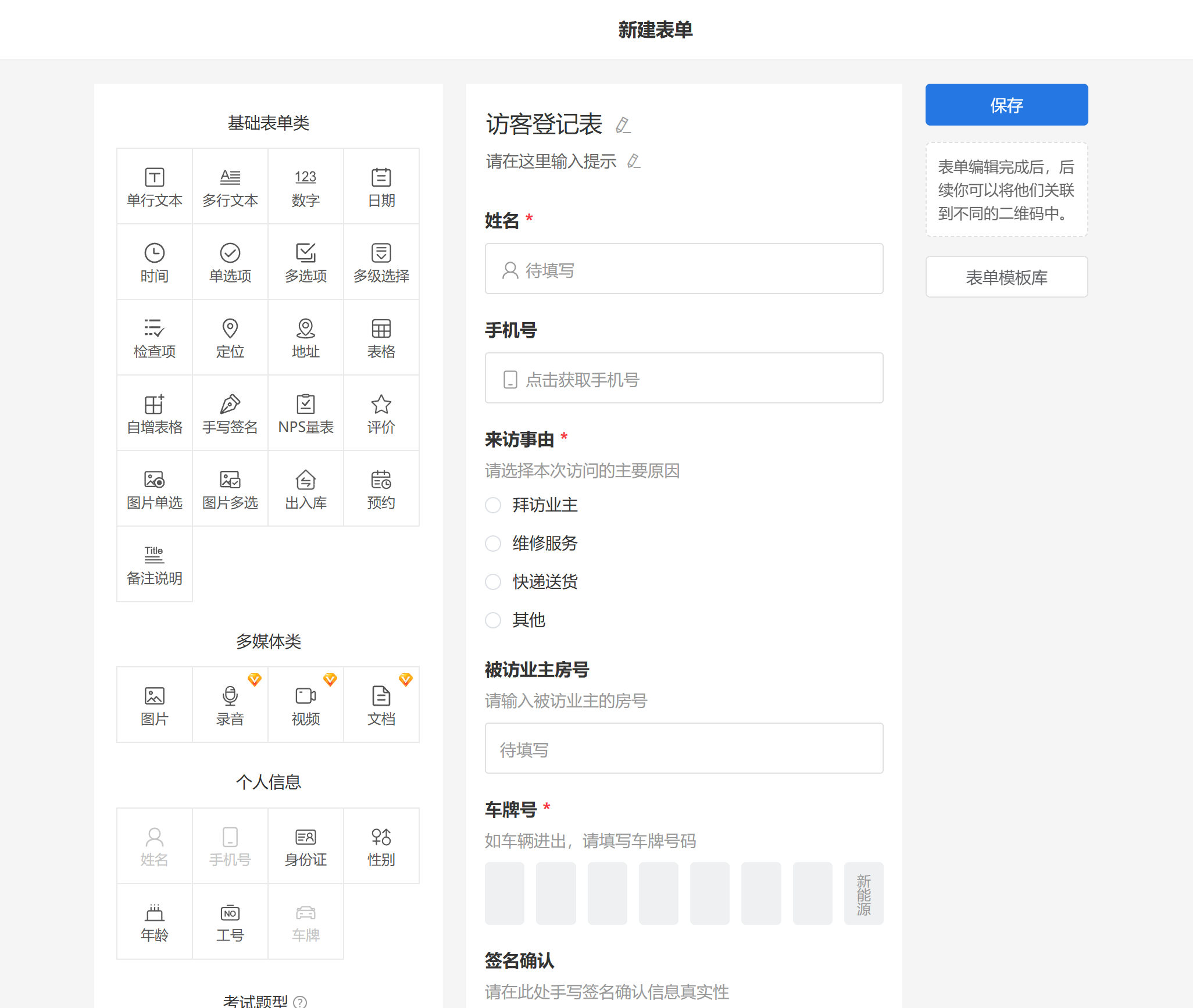 信息结构化:表单字段可定制,支持文本、手机、身份证、车牌等。