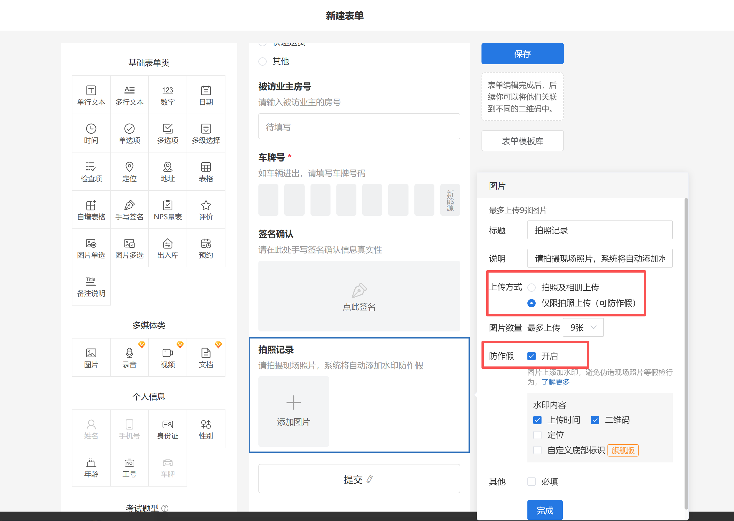 - 拍照记录(图片组件,开启“只允许拍照”+“水印”防作假)