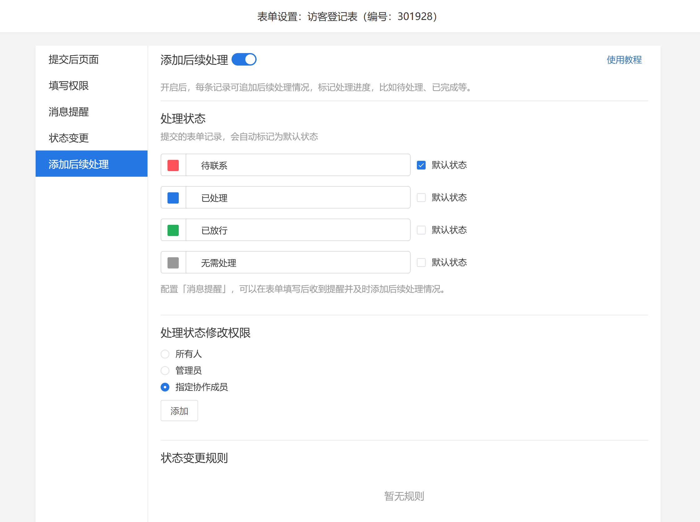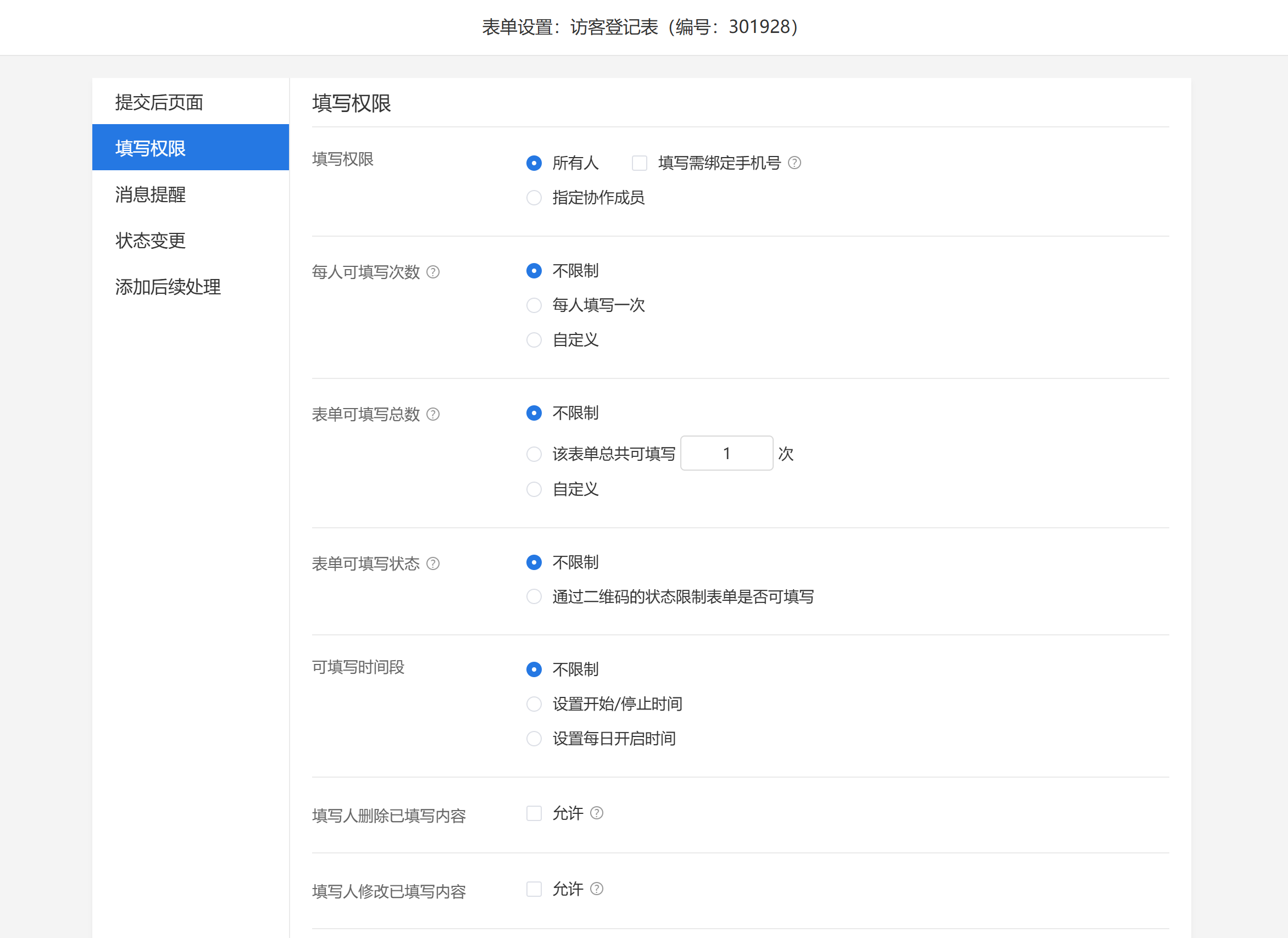 - 限制填写人员:仅允许指定协作成员(如物业员工)填写,或开放给所有人。