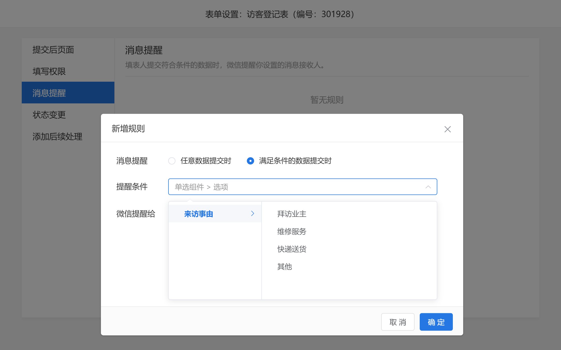 - 特定条件提醒:如来访事由为“维修紧急”,可指定提醒维修主管。