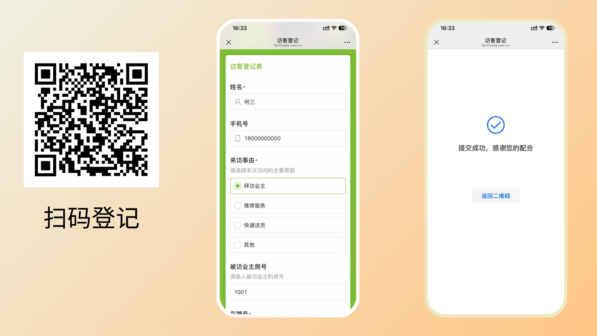 适用于亲友拜访、快递外卖等临时人员,扫码后填写基本信息,提交即完成登记。