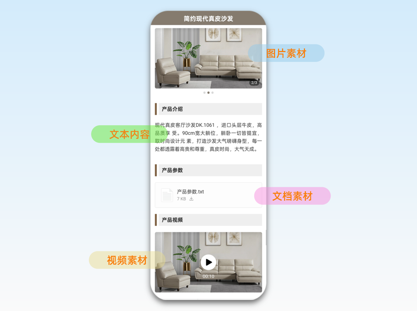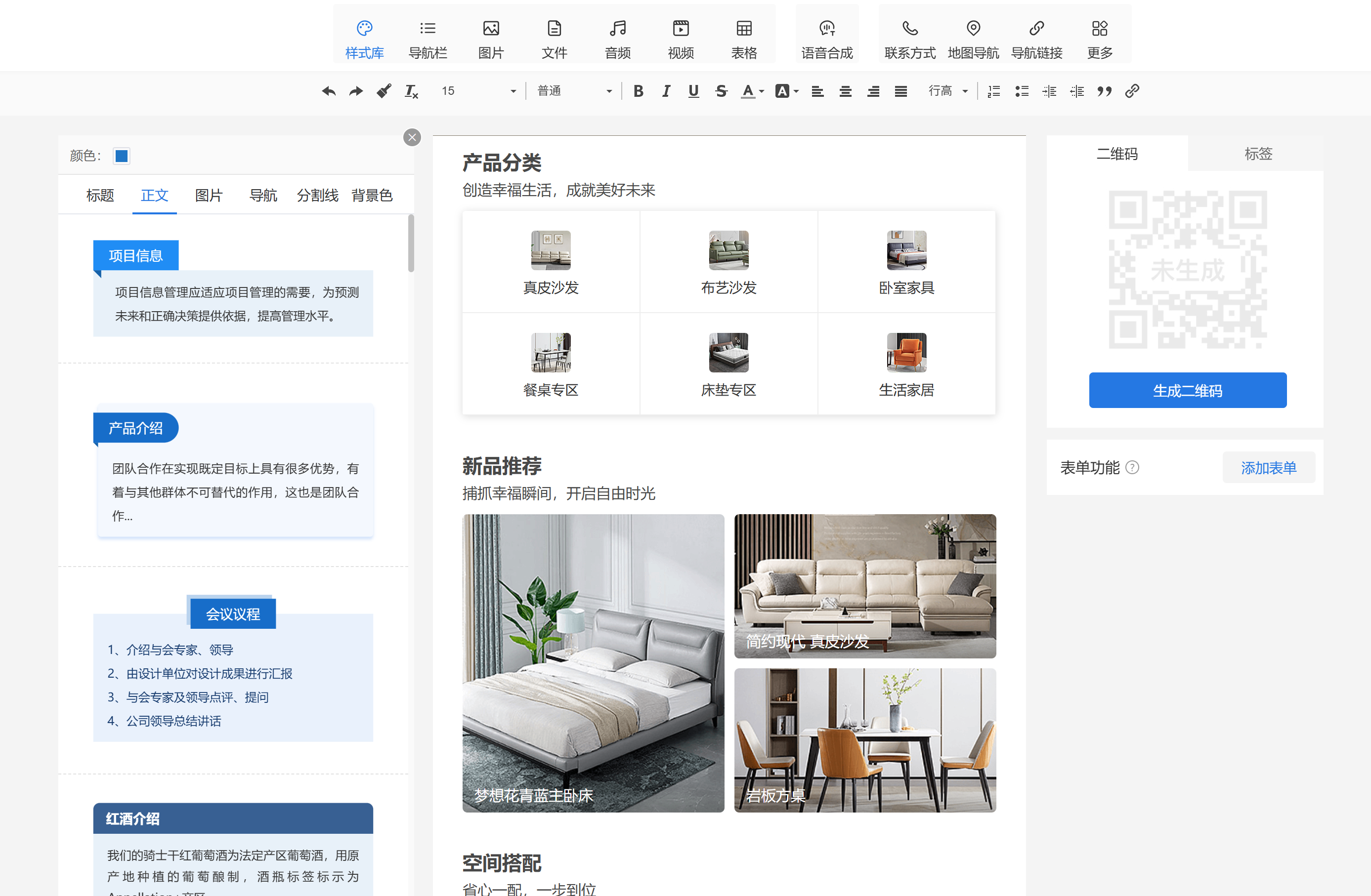 如同一个微型的网页编辑器,允许用户自由组合图文、视频、文件、表格、联系方式等多种内容,并利用样式库和导航链接,打造专业、美观的落地页。