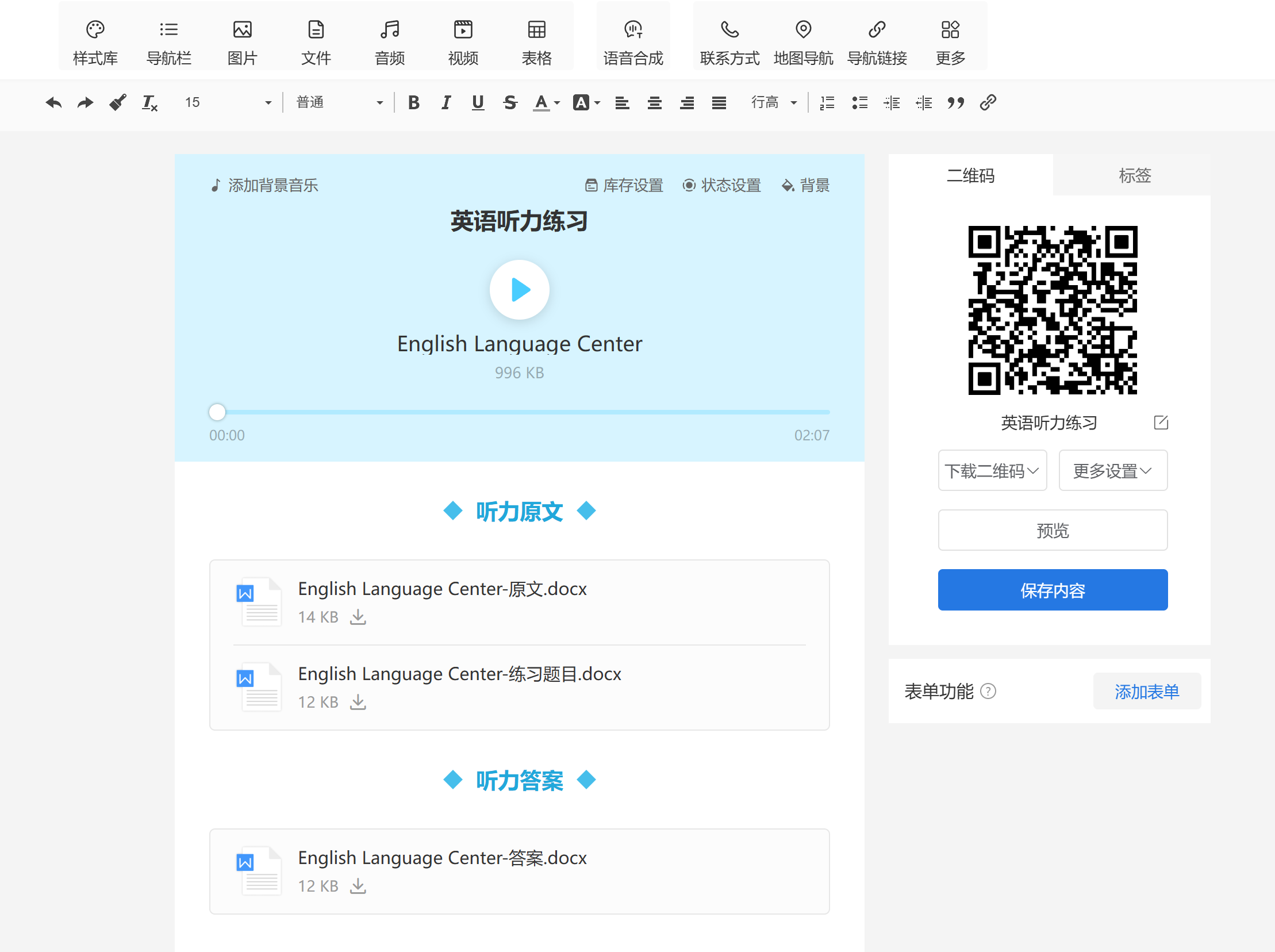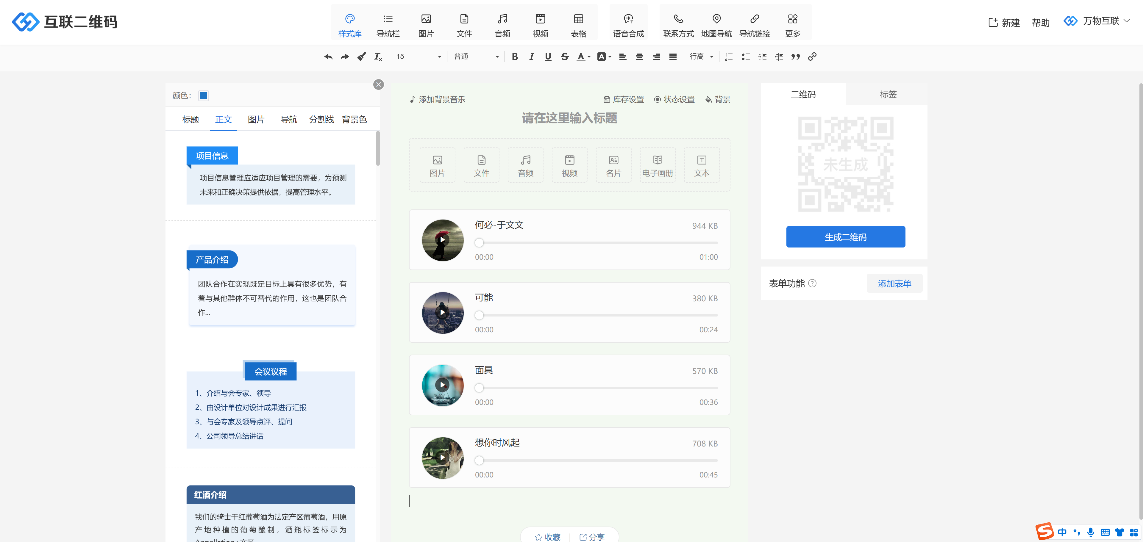 如果您需要将多个录音文件(如系列课程、多段采访)整合在一个二维码中,互联二维码生成器的高级编辑器可轻松实现。您可以在一个页面中上传多个文件,并自由排序、命名,生成一个集成了所有音频内容的综合二维码,方便用户连续收听。