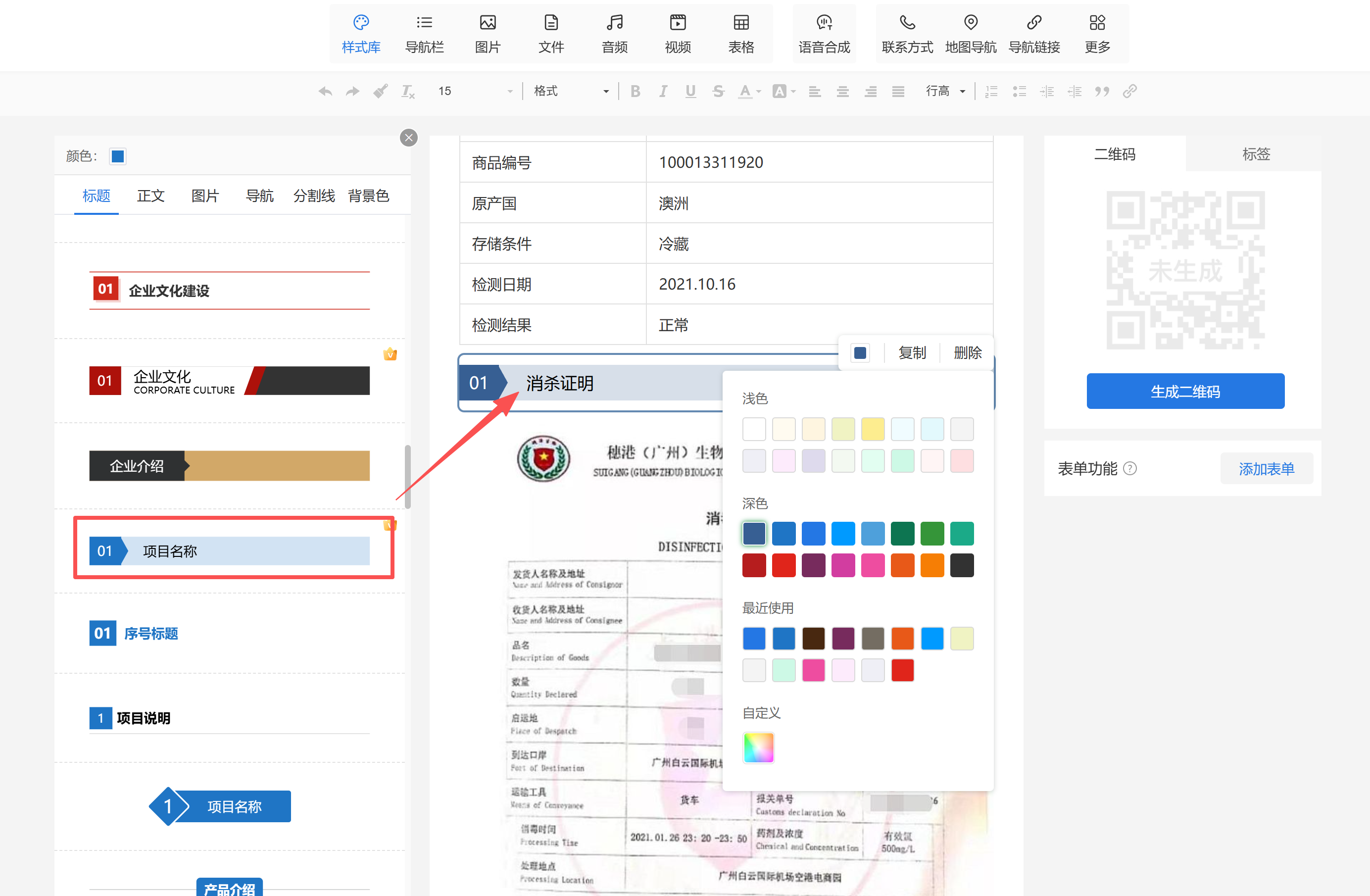 操作:添加“标题”模块,输入“动物产品检疫证明”,并可将颜色设为蓝色等庄重色系。随后添加“表格”,填入检疫证号、签发机构等概要信息。利用“分割线”区分不同板块,使布局一目了然。