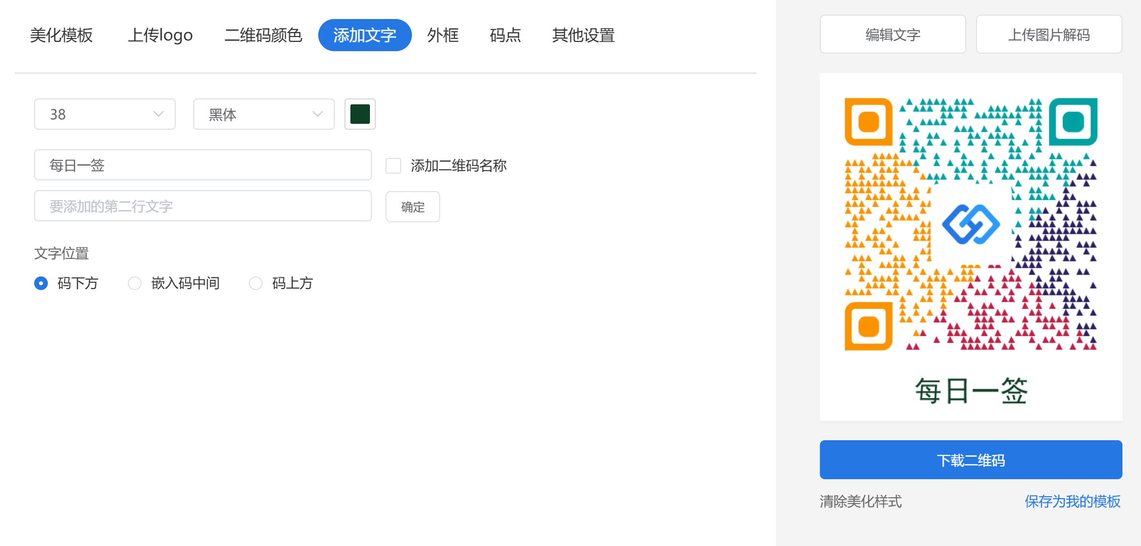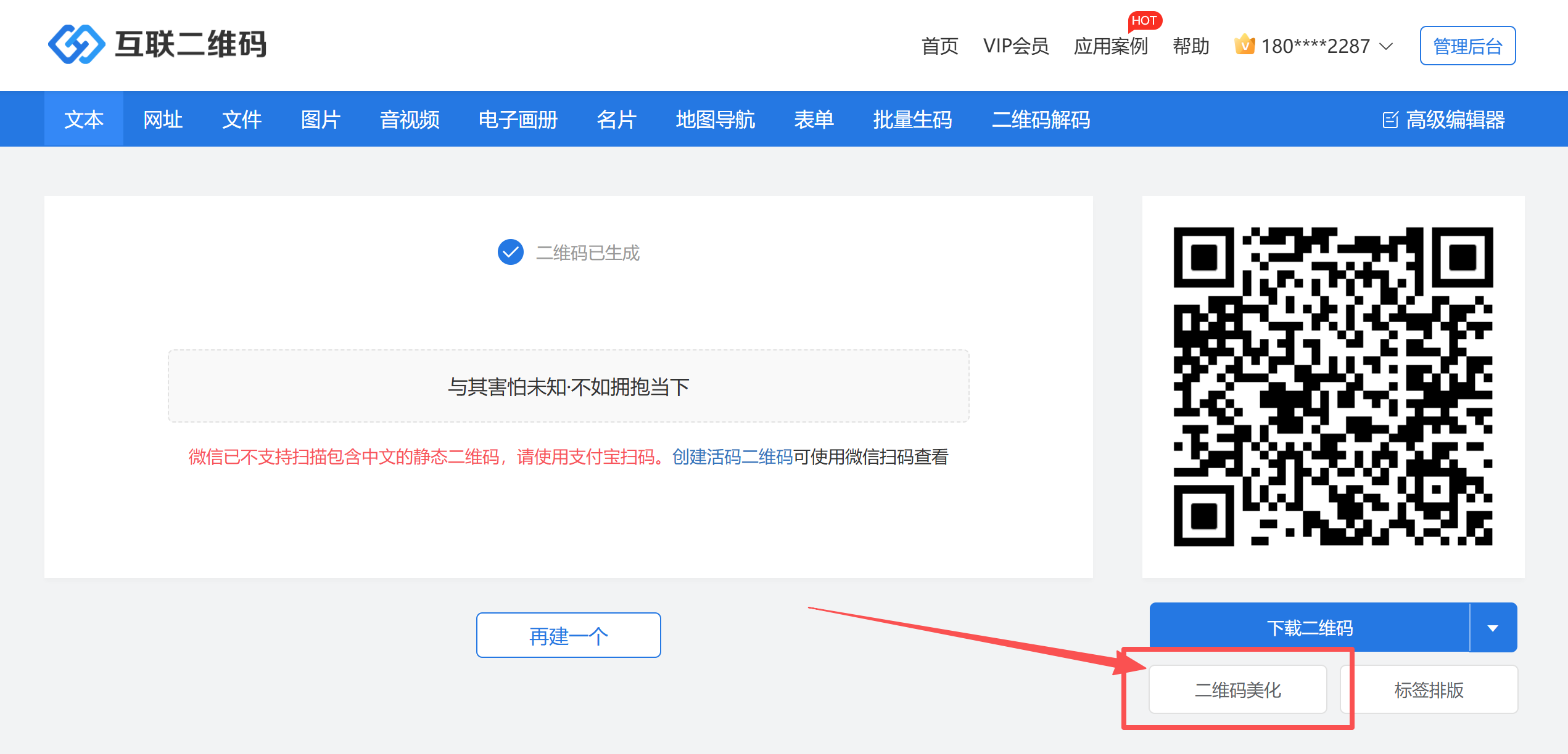 对于已生成的静态码,点击「二维码美化」即可进入编辑界面。