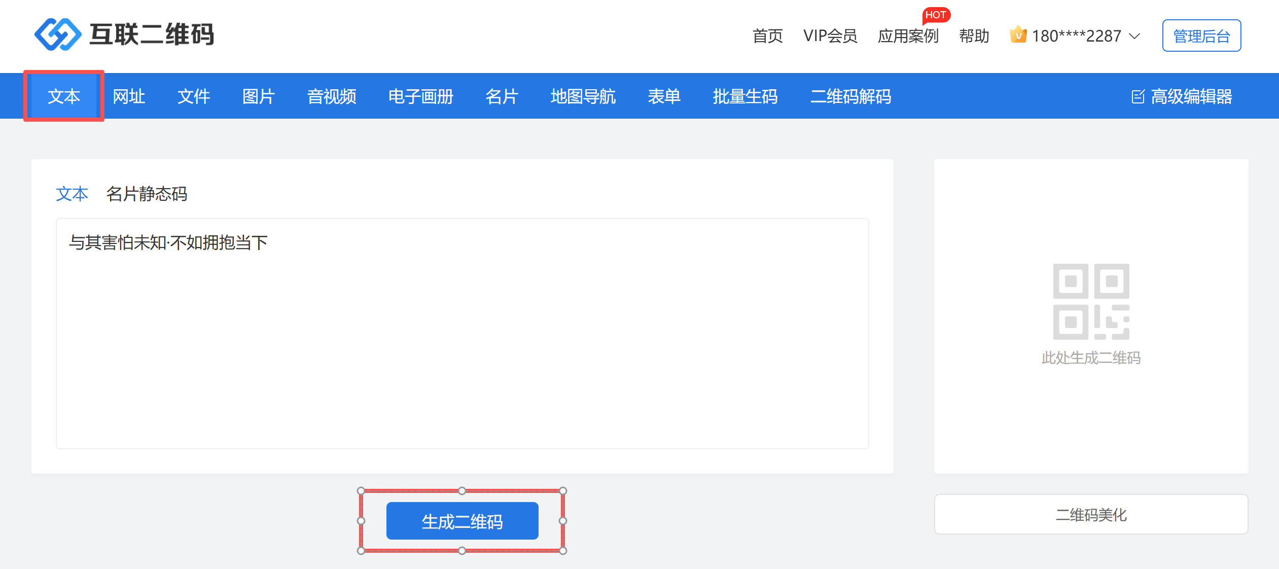 在编辑框中粘贴或输入需要转换的文本内容,支持中英文、符号、链接等,点击生成即可实时预览二维码。