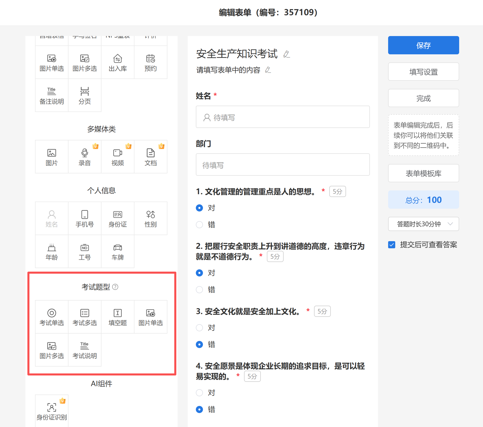 在编辑器右侧点击“添加表单”,选择“新建表单”,进入表单编辑器后,使用“考试题型”组件,快速搭建一套完整的考卷: