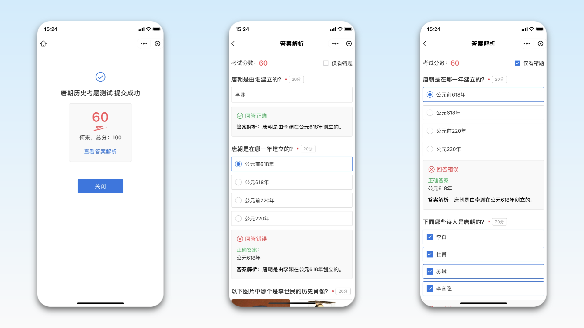 答案解析:每道题可设置解析,帮助学员理解错误原因